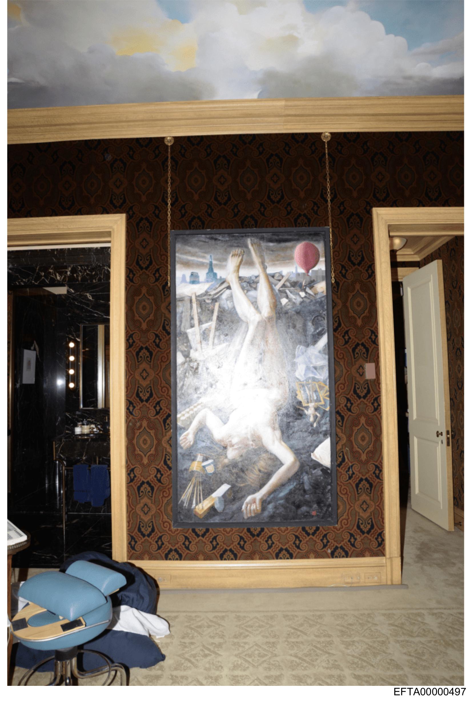 The image depicts the interior of a room with a distinctive wall feature. On the wall is a large painting or mural that portrays a classical scene, possibly a representation of mythological figures or gods. The artwork exhibits detailed and vibrant colors, and there appears to be a central figure in an elevated position surrounded by other characters. Above this central element, there's what looks like a cloud formation or a stylized depiction of clouds. In the foreground, there is a patterned wall covering that includes floral designs and possibly some paisley elements. The walls are adorned with multiple panels that add texture to the room's decor. To the right side, there seems to be an open doorway leading to another area of the building. The floor has a carpet, but details of the flooring design are not fully visible. In the lower left corner, partially out of focus, is a piece of furniture that could be a chair or a bench with cushions on it. There's no text visible in the image, and the location appears to be an interior space within a building designed for aesthetic display or possibly as a part of a private collection given the quality of the artwork. The style of the room suggests a blend of traditional classical art with a more modern design, especially evident in the contrast between the classical wall painting and the contemporary patterned wallpaper.