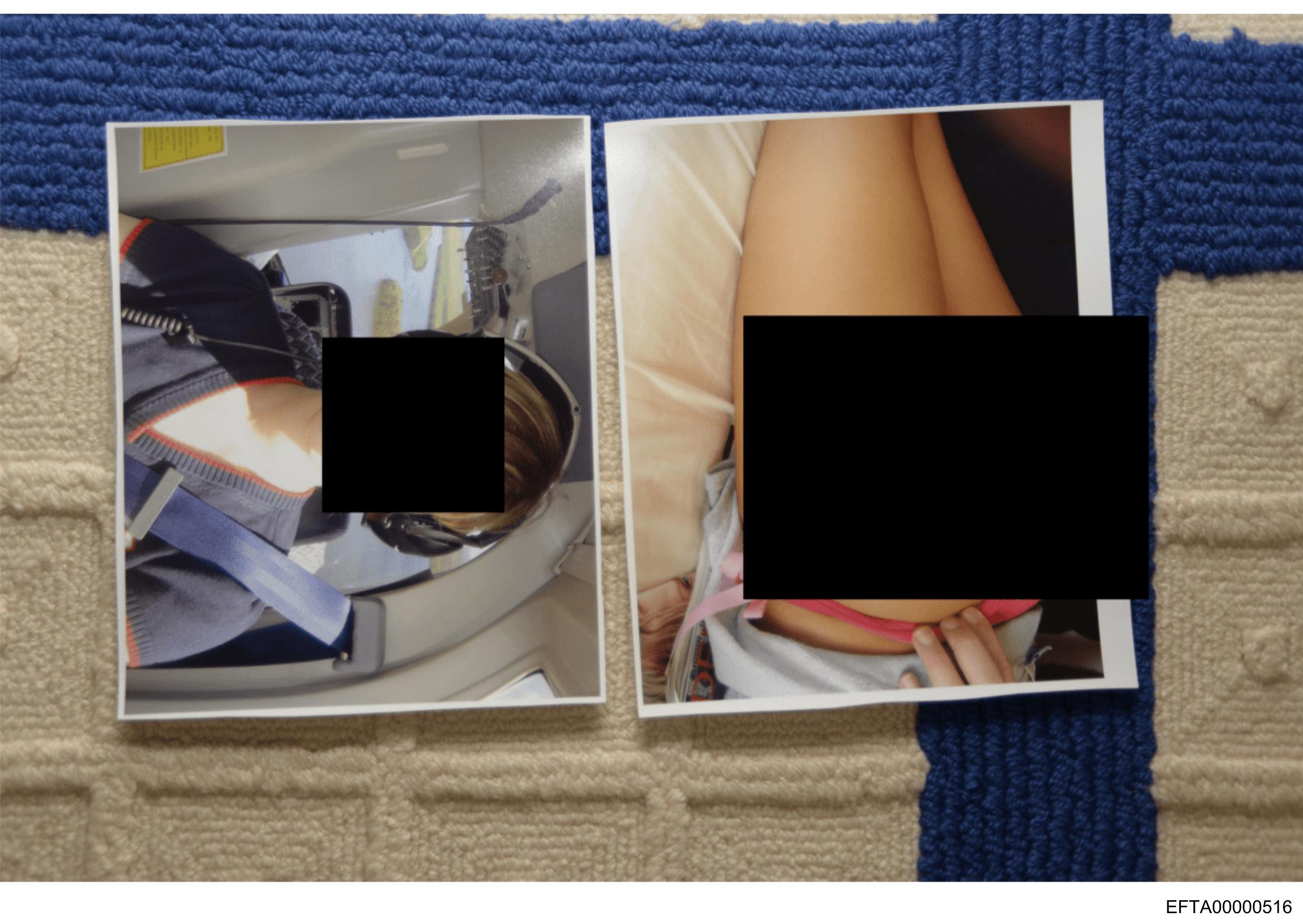The image shows two photographs placed side by side on a surface that appears to be carpeted with blue and beige tones. On the left photo, there is an individual wearing a dark uniform with visible insignia, suggesting they may be a member of law enforcement or a similar organization. The person's face has been redacted with a large black bar, obscuring their identity. They are seated in a vehicle that seems to be equipped for official duties, possibly a police car or an ambulance. On the right photo, there is another individual whose upper body and head have also been redacted with a large black bar. The person is wearing what appears to be lingerie or underclothes, and only their torso and legs are visible. The setting is not clearly defined but seems to be indoors, and they are sitting in an upright position. There is no text present in the image that provides additional context or information about the individuals depicted. The style of the photograph suggests it may have been taken with a smartphone due to its casual composition and quality.