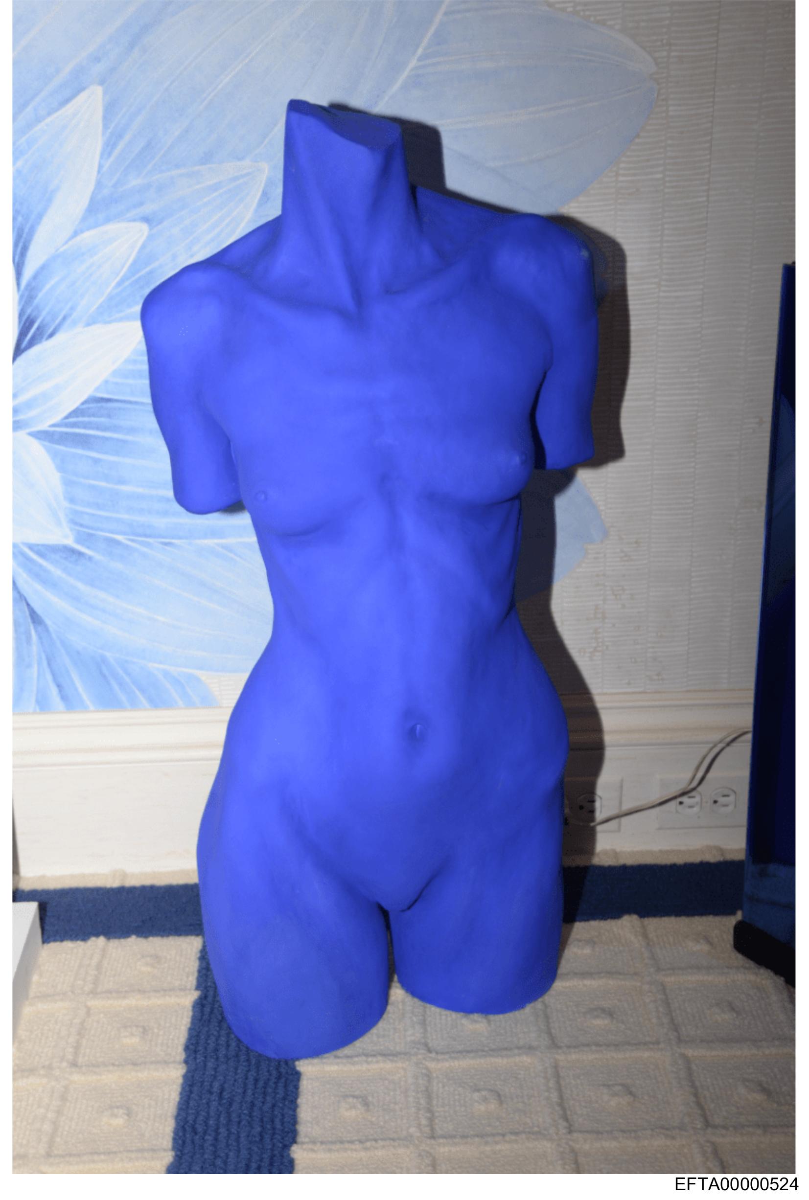 The image shows a mannequin body with no arms or head. It is painted entirely in blue and appears to be standing on a carpeted floor. The background features wallpaper with floral patterns, suggesting an indoor setting, possibly a home or studio. There are no texts, people, or other significant objects visible in the image.