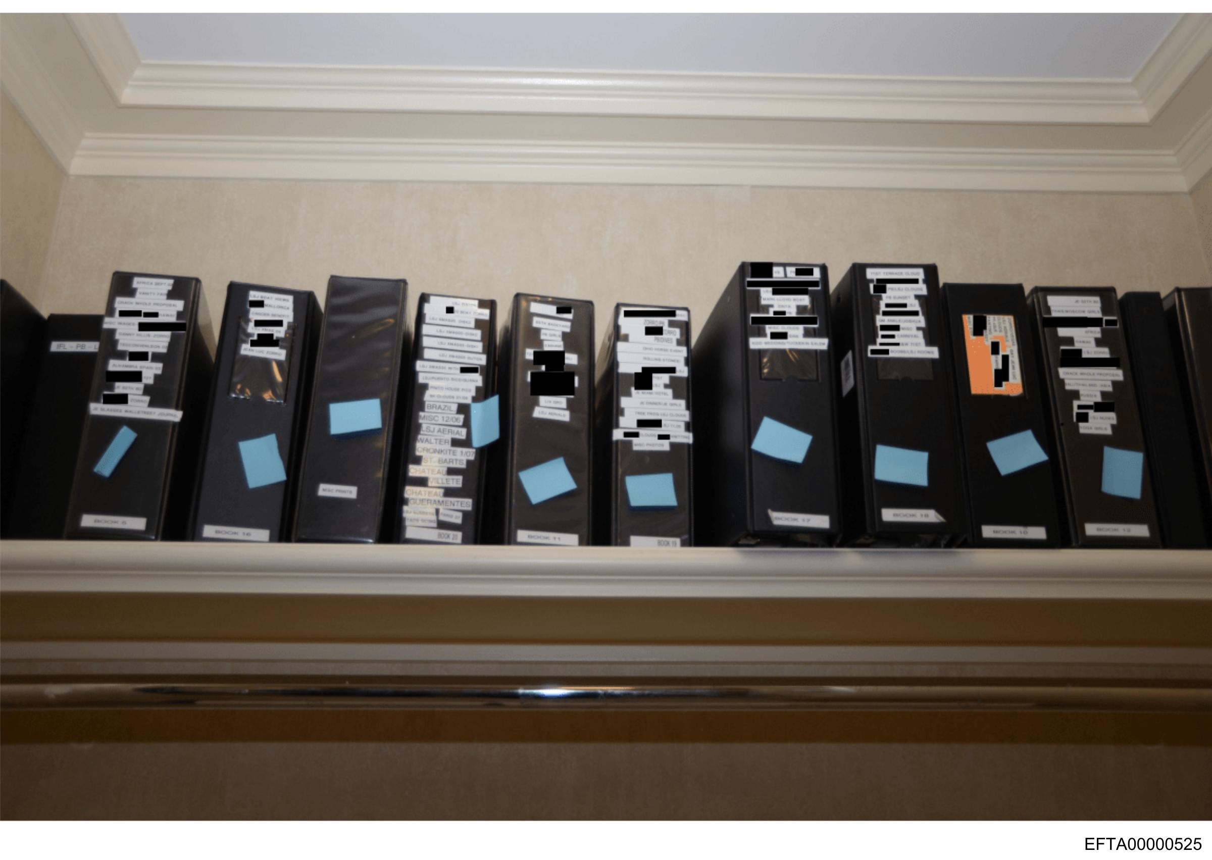 The image shows a collection of files and documents on a shelf or desk.