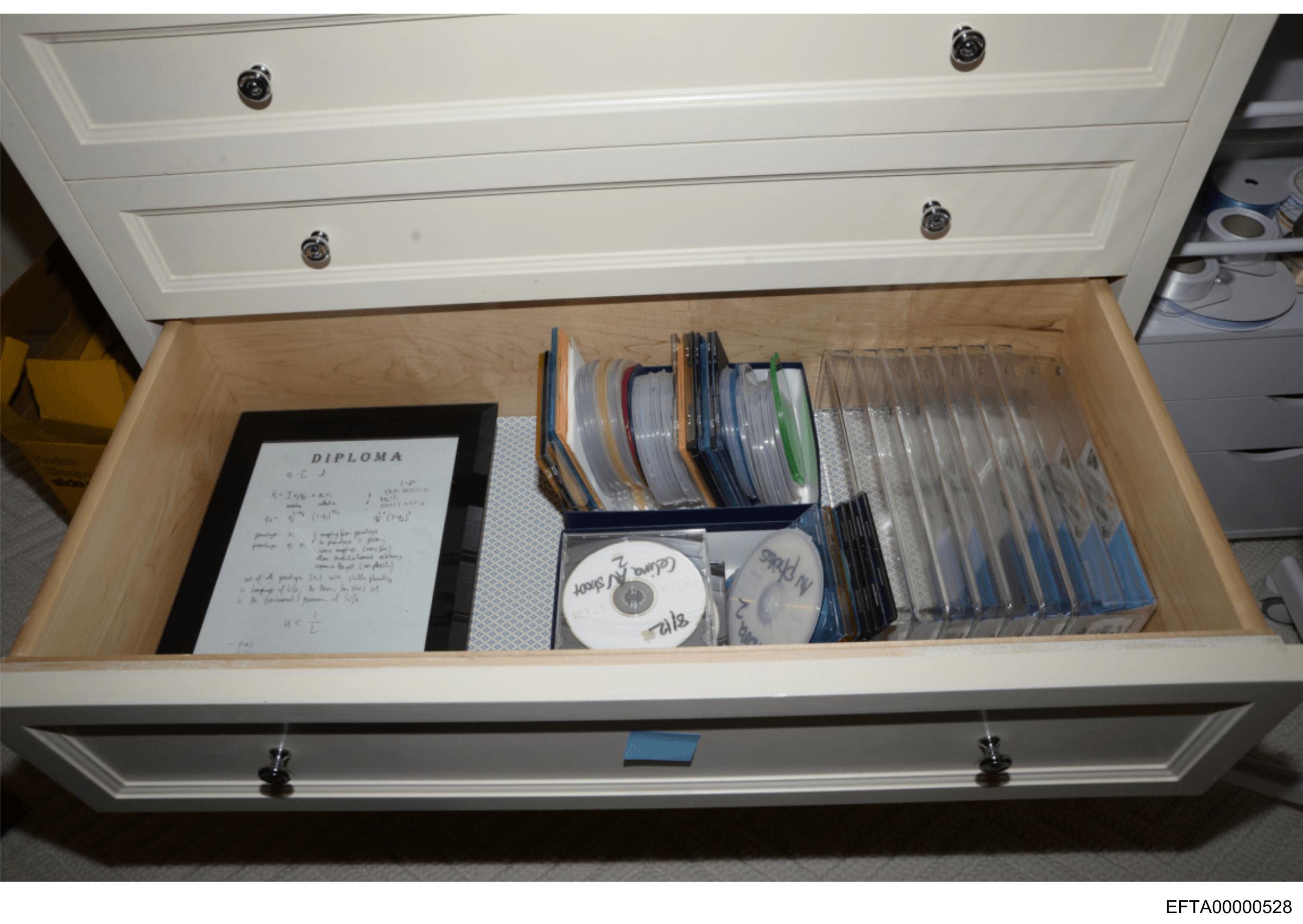 The image displays the interior of an open drawer unit. The drawer is filled with various items including what appears to be a collection of CDs and DVDs organized in plastic cases. These media formats are typically used for storing digital data such as music, movies, or software. There is also a piece of paper within the drawer, but it's not possible to read its contents from this angle. The overall condition of the items suggests that they have been stored here for some time, with no visible wear and tear. The image does not provide any additional context about the location, the owner, or the purpose of these media.