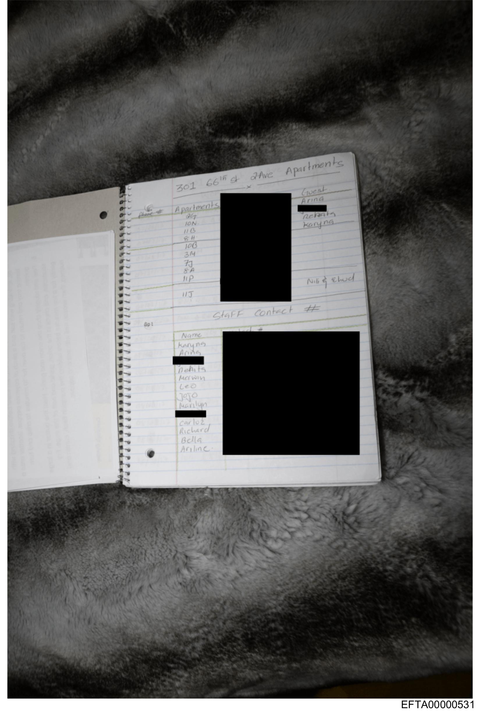 The image shows a spiral notebook with some pages visible and others obscured by what appears to be a digital overlay or a sticker covering the sensitive information on those pages.