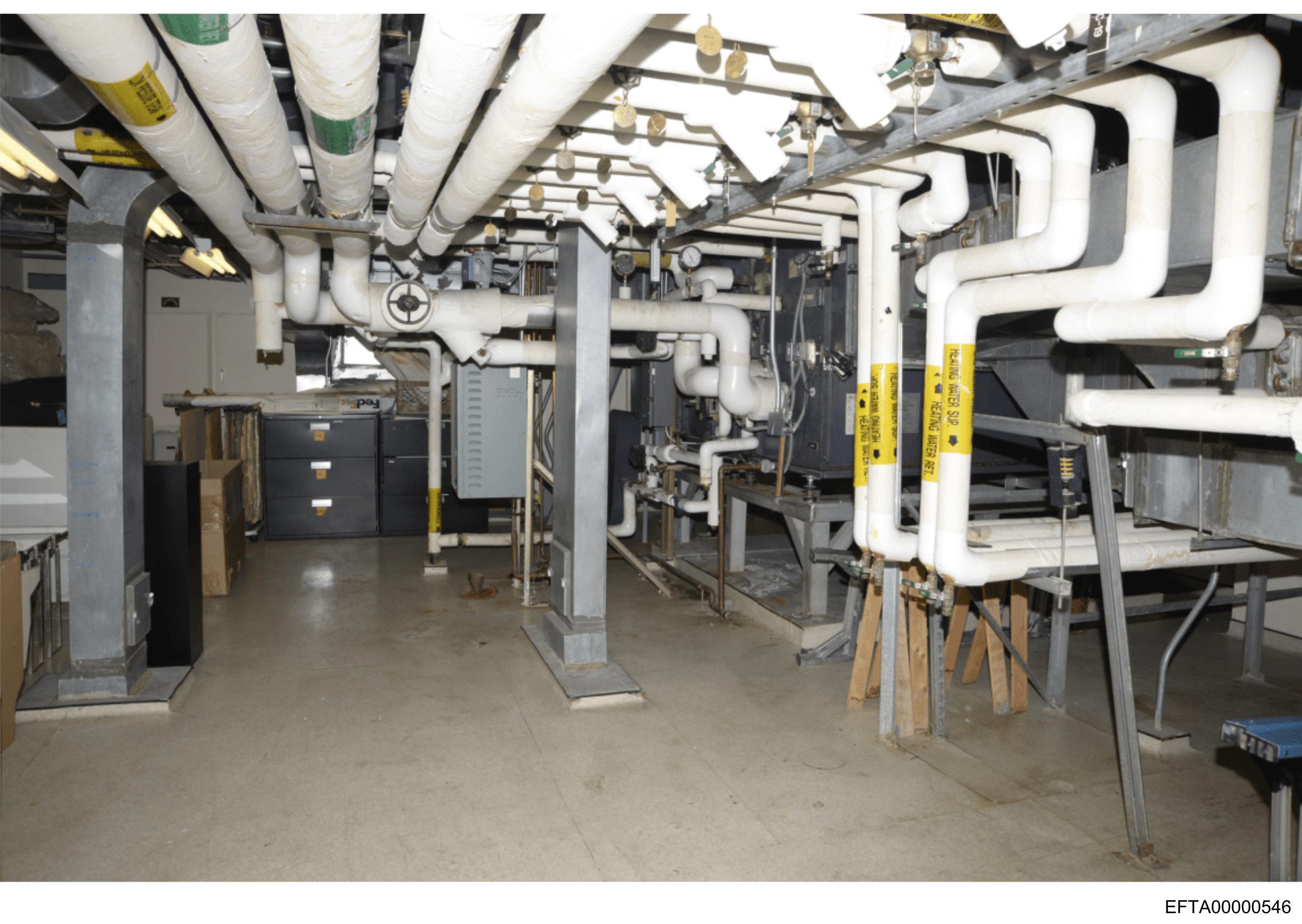 The image shows an indoor space with a complex system of white pipes and ductwork arranged overhead.