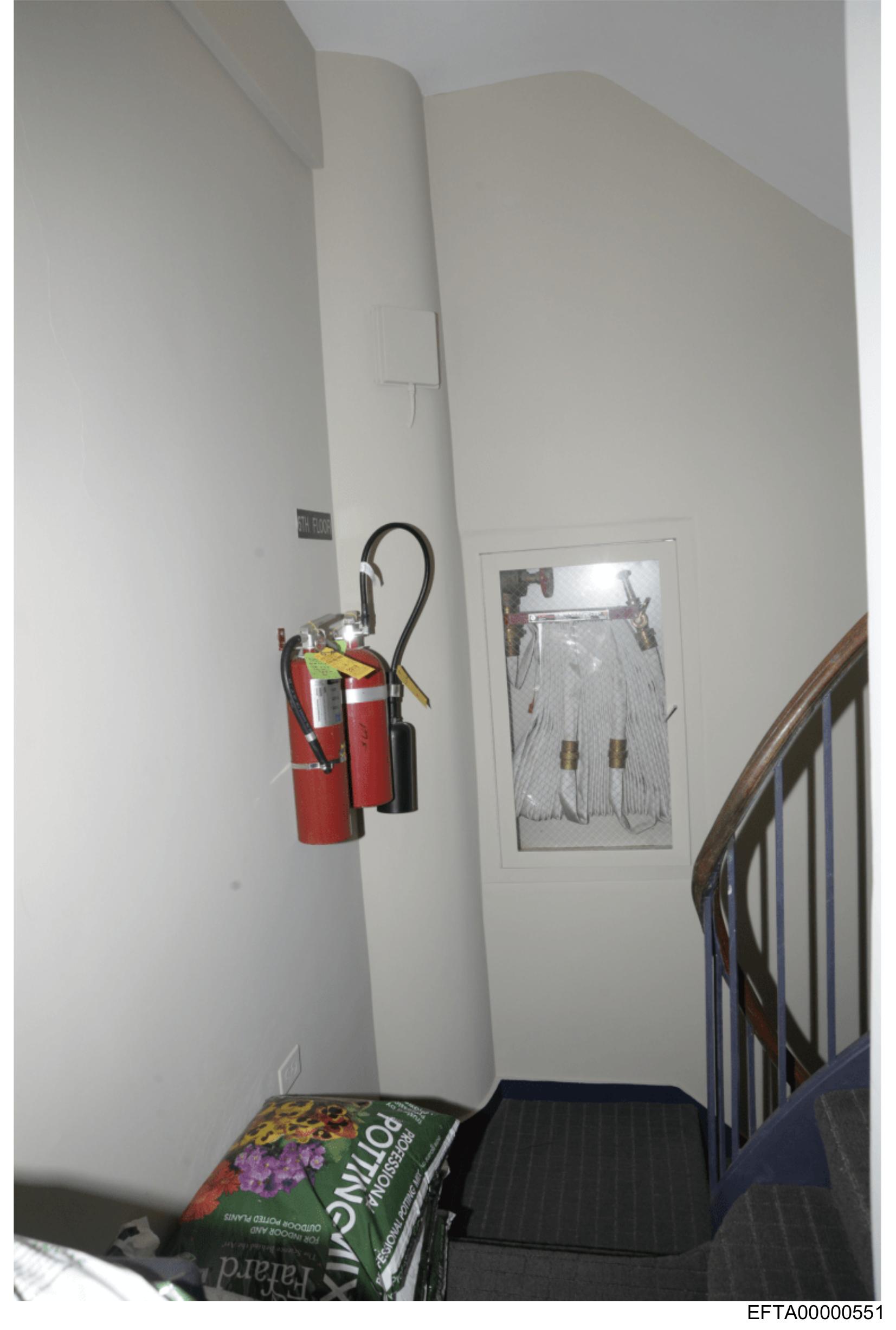 The image shows a small room with a focus on a red fire extinguisher mounted on the wall to the right. In front of the room stands a staircase railing, indicating that the room is located at the top of the stairs. There are no people visible in the image. On the ground next to the stairwell, there appears to be a white plastic bag or container with some items inside, but it's not clear what these items are from this angle. The photo has a watermark that reads "ET10825" on the bottom left corner.