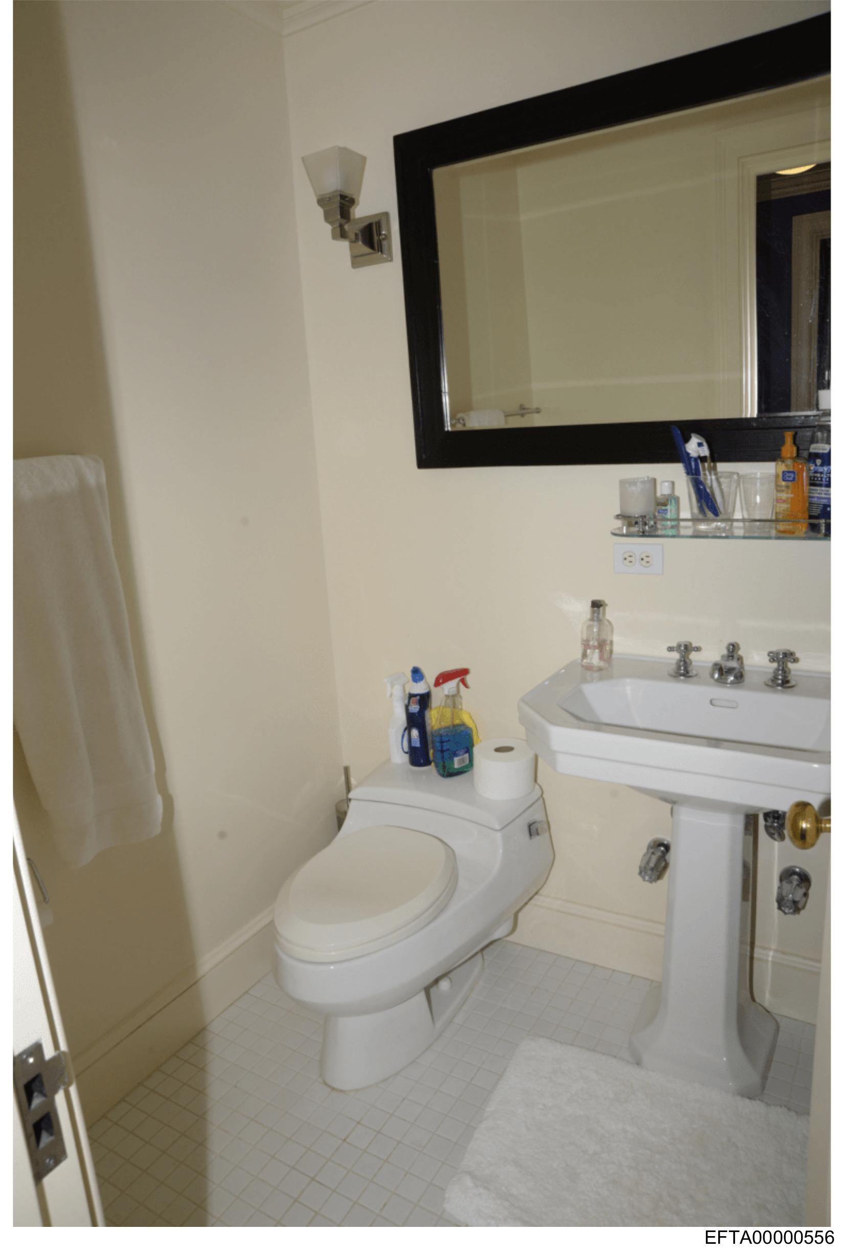 The image depicts a bathroom interior with a white toilet positioned to the left side of the frame and a sink on the right.
