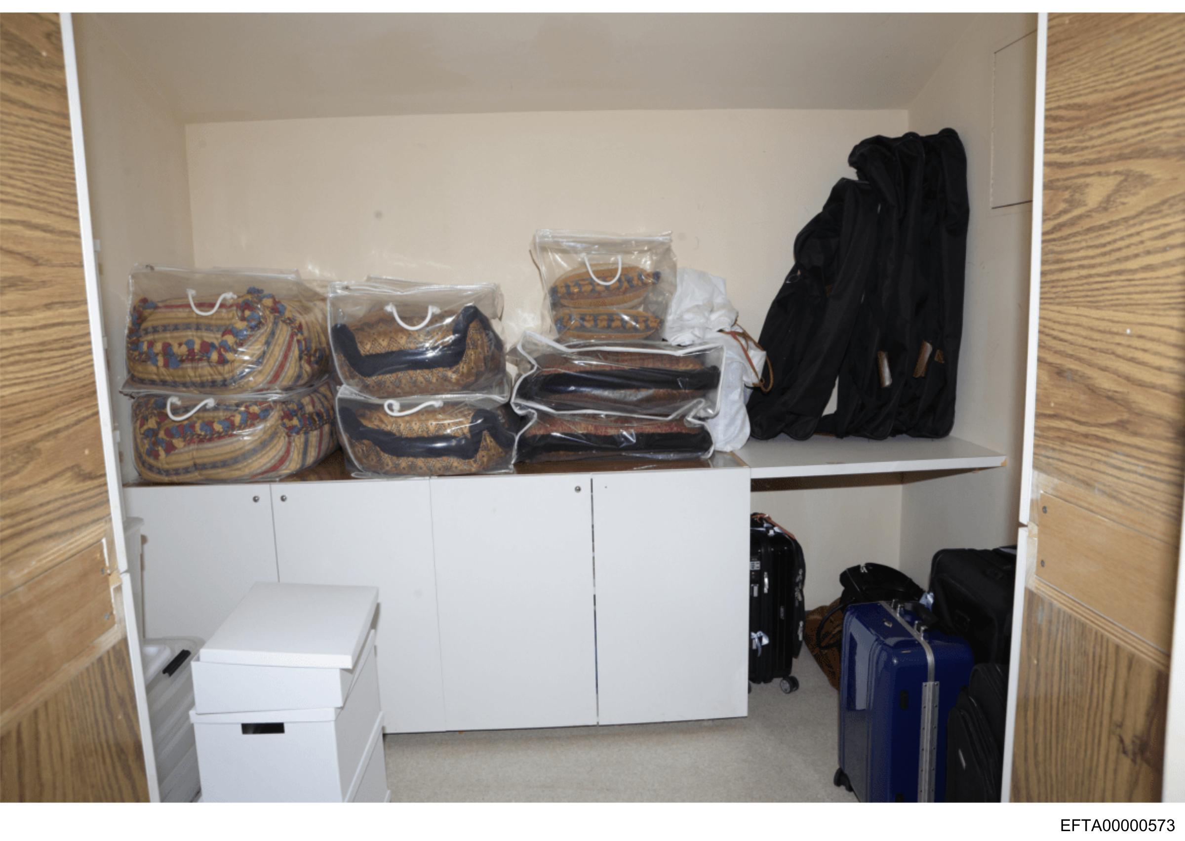 The image depicts an interior space, possibly a storage room or warehouse. There is a large white cabinet with multiple drawers on the left side. On top of this cabinet, there are several packages wrapped in clear plastic, varying in size and shape, suggesting they contain different items. To the right of the cabinets, there's a collection of black bags stacked neatly. The flooring appears to be carpeted. In the bottom right corner, partially obscured by the stacks, is what looks like a piece of luggage or storage container. There are no visible texts or logos that can be discerned from this image.