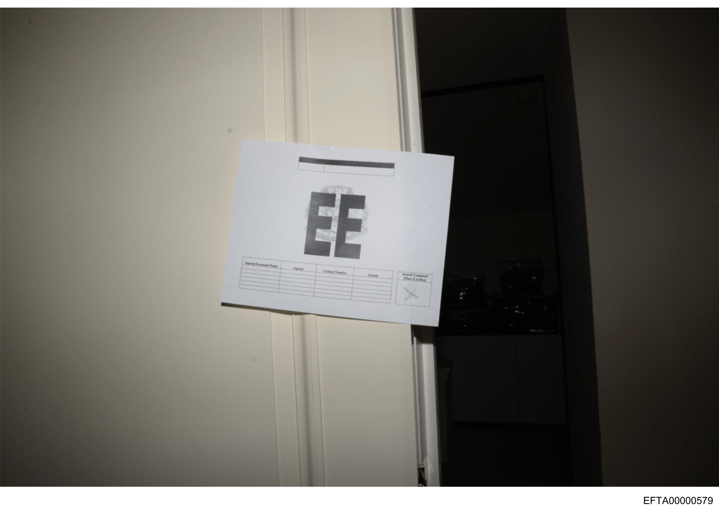 The image shows a piece of paper taped to a door with some writing on it. The paper has black letters and numbers printed on it; however, the content of the message is not fully legible due to the angle and resolution of the photo. There appears to be a blurred background, possibly an interior space, but no distinct features can be discerned. The overall quality of the image suggests it may have been taken with a camera or phone in low light conditions, leading to some graininess and lack of clarity.
