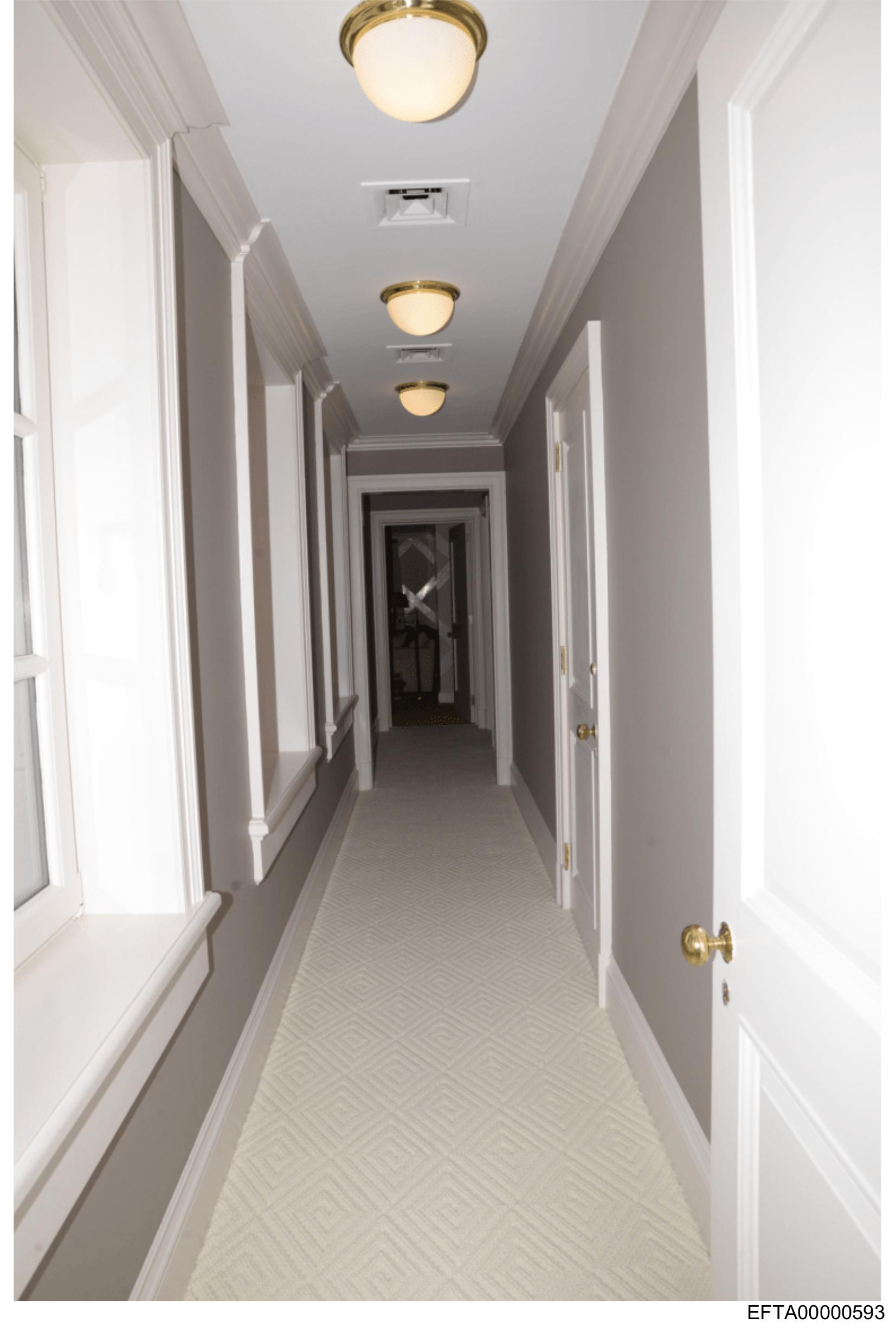 The image depicts an indoor corridor with a series of evenly spaced doors on either side.