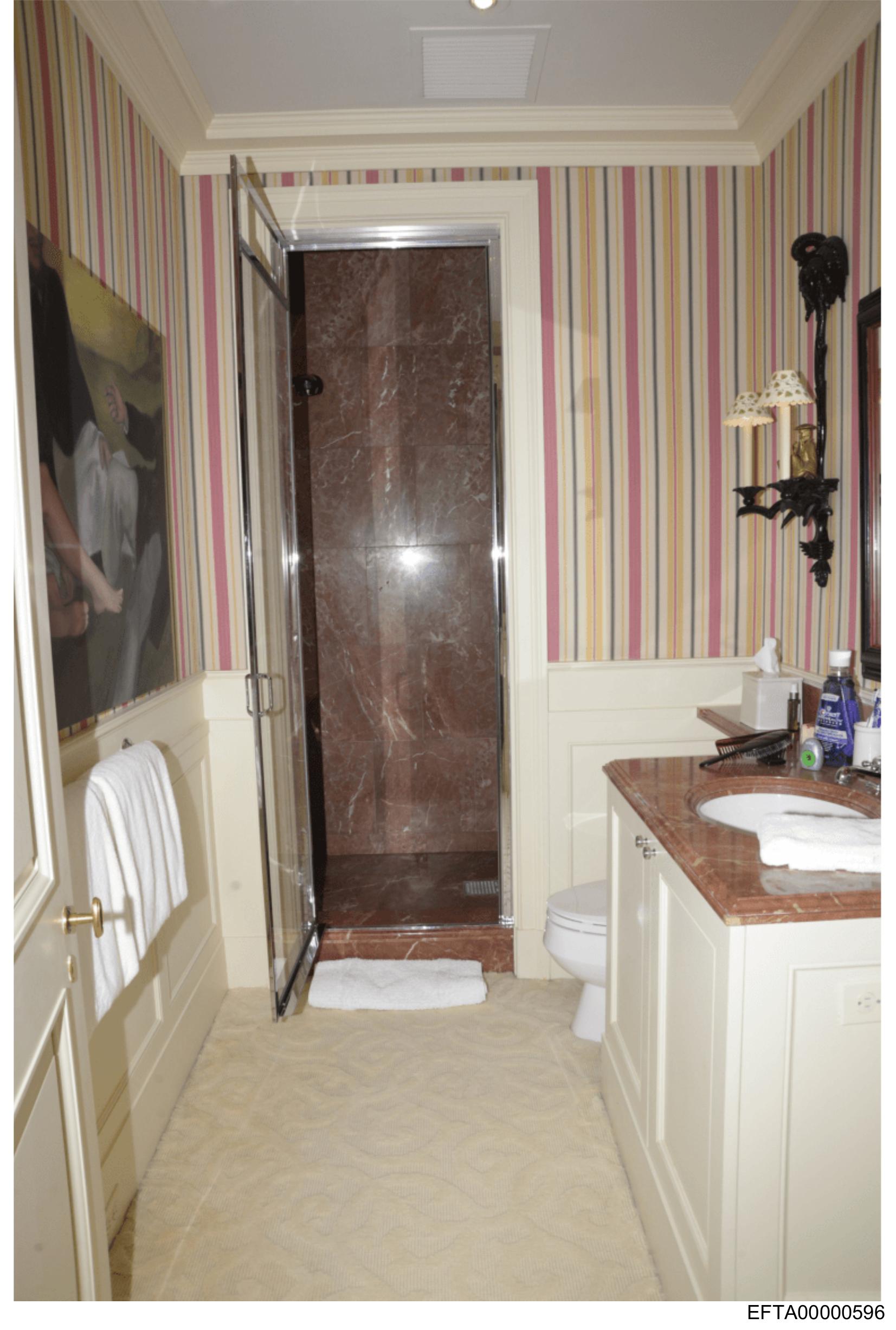 The image shows a well-lit bathroom with a modern design. There is a large mirror hanging above the sink area, which reflects part of the shower and the colorful wall decoration behind it. The shower has dark tiles that contrast with the light color of the restroom. A towel is neatly placed on the floor next to the door of the shower. The sink basin appears to be made of marble or a similar stone material. There are no visible texts, people, or significant objects other than what's described.