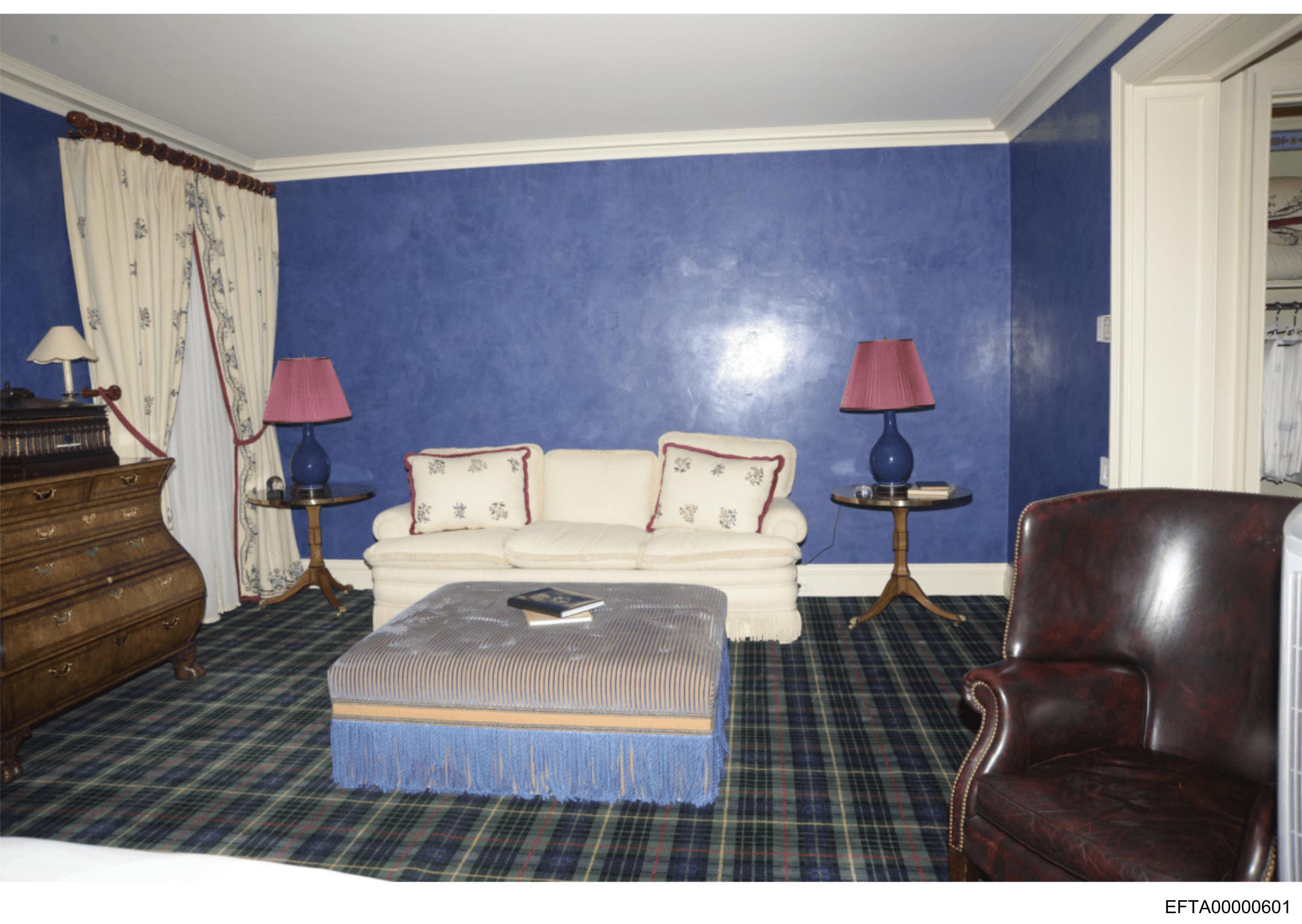 The image depicts an interior room with blue walls and a carpeted floor that has a plaid pattern.