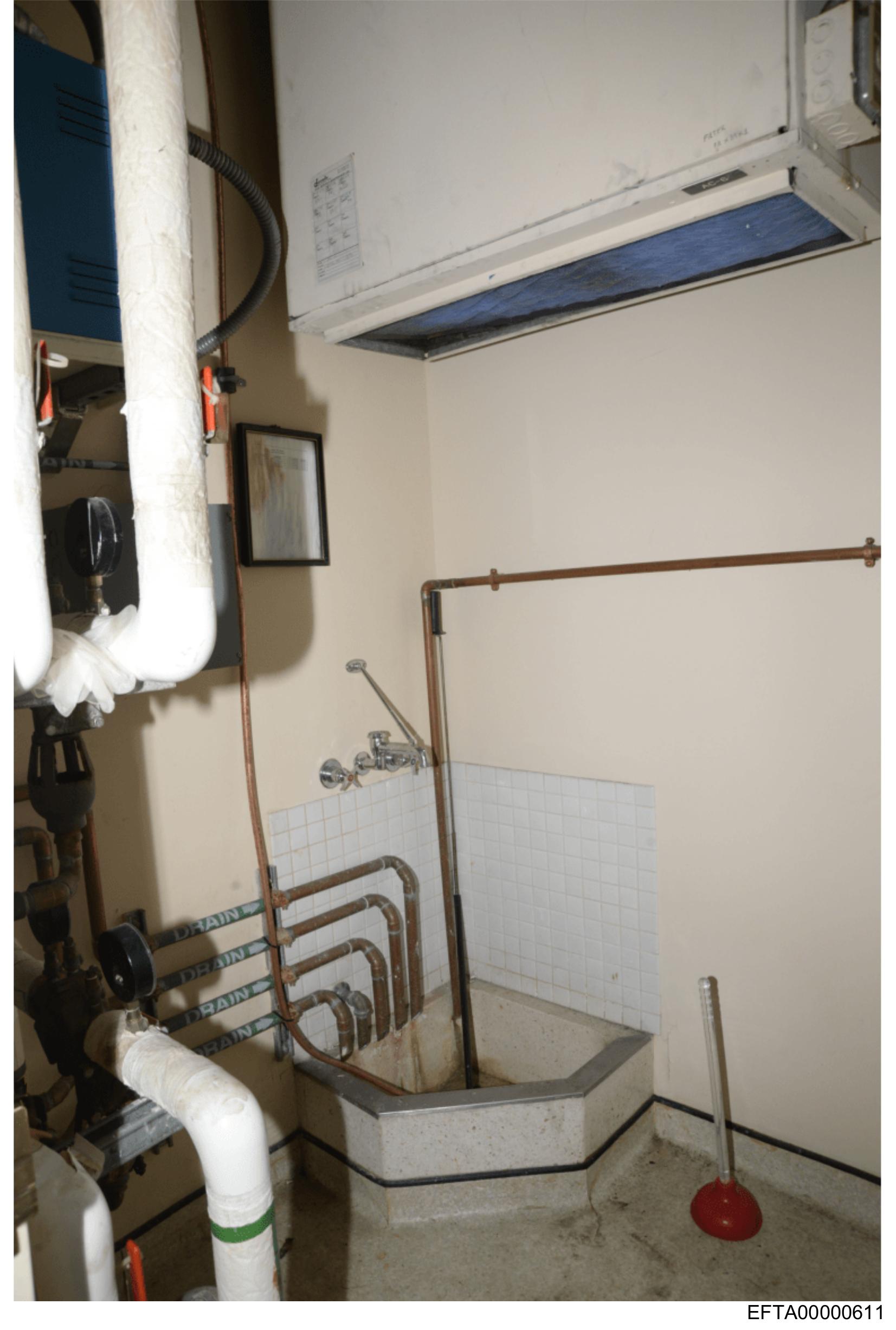 The image shows an industrial setting with various pieces of equipment and mechanical components. Dominating the scene is a large cylindrical object with pipes connected to it, suggesting some kind of machinery or processing unit. To its right, there's a small sink set into the wall, which has several copper pipes running above it. The walls are tiled in a neutral color, and the floor appears to be concrete. There's visible text that includes "EST" followed by what could be a date, but without a clear view of the entire date, it's not possible to determine its significance. The style of the image is candid and seems to have been taken for informational or documentation purposes rather than artistic intent.