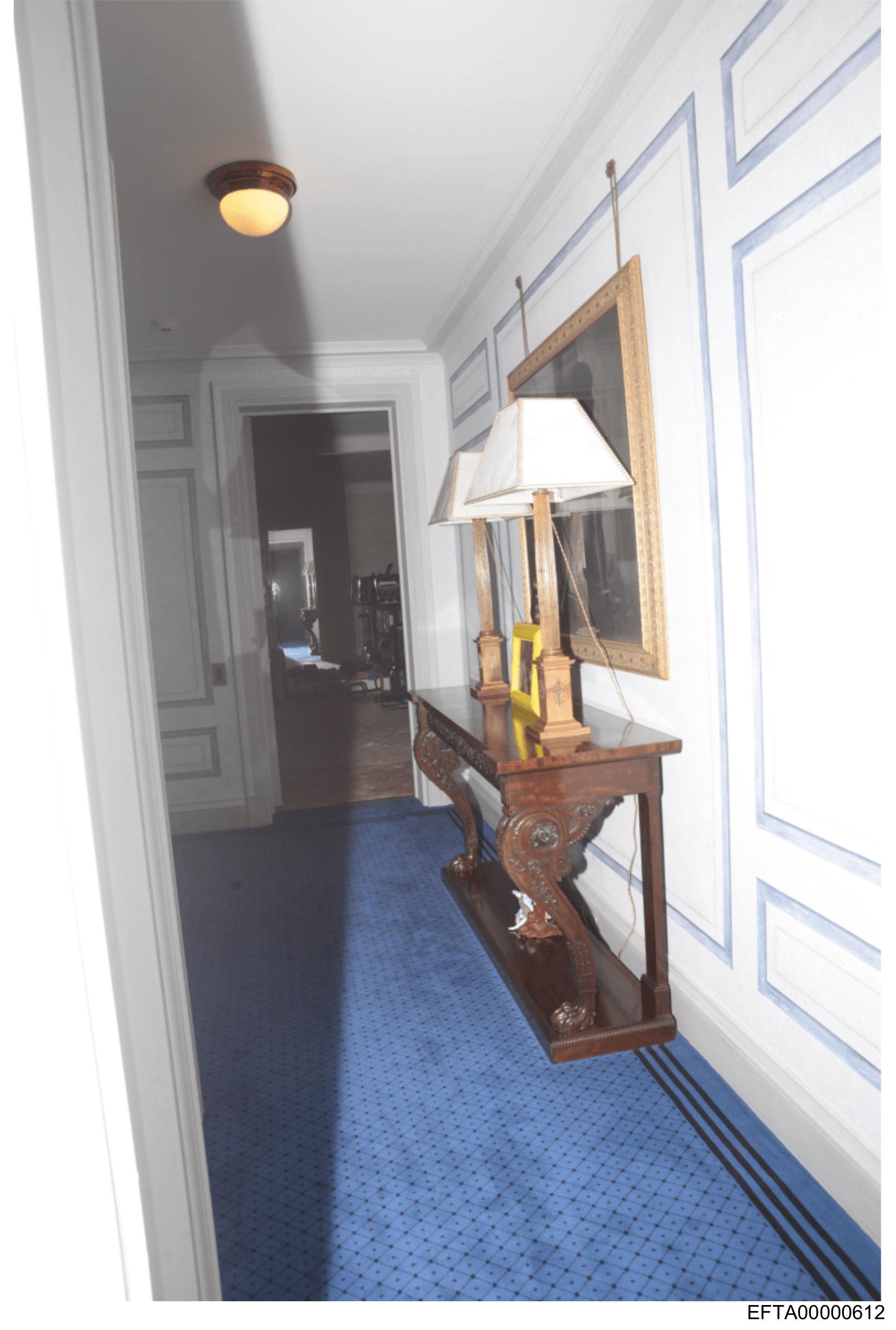 The image shows a hallway with high ceilings and decorative walls. A chandelier hangs from the ceiling, casting light on the area below. To the left of the frame, there's an open doorway leading to another room with indistinct details. The floor is covered by a blue carpet that has a patterned design. On the right side, part of a wooden cabinet with shelves and a lamp can be seen. There are no texts or visible people in the image.
