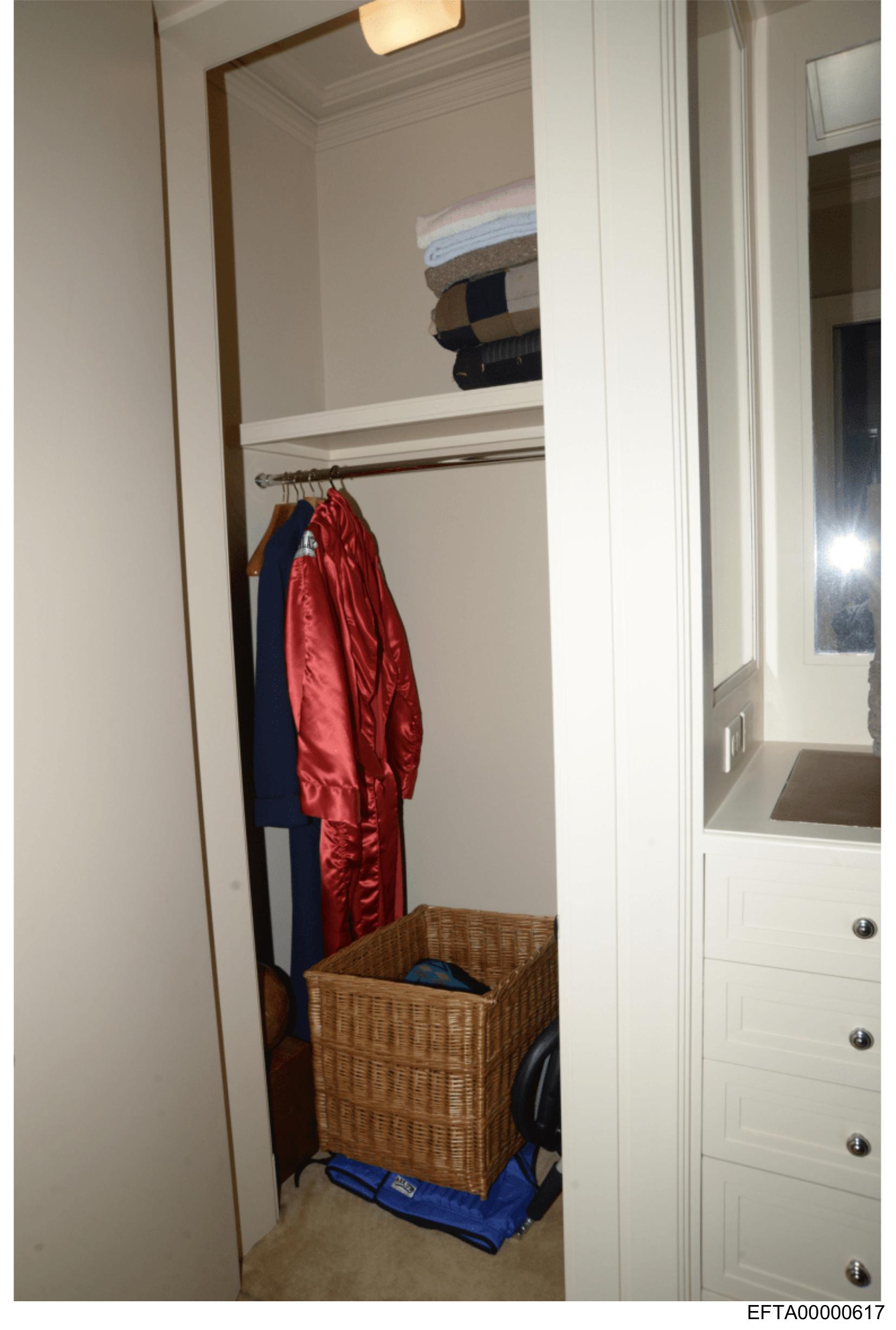 The image shows an interior space that appears to be a closet with various items. There's a red garment hanging from one of the hangers. A basket is on the floor near the bottom right corner of the photo, and it looks like there might be some belongings inside. The walls are painted in a light color, and there is no text visible in the image. The style of the photograph suggests that it was taken casually, perhaps to show off one's wardrobe or to document the organization of personal items.