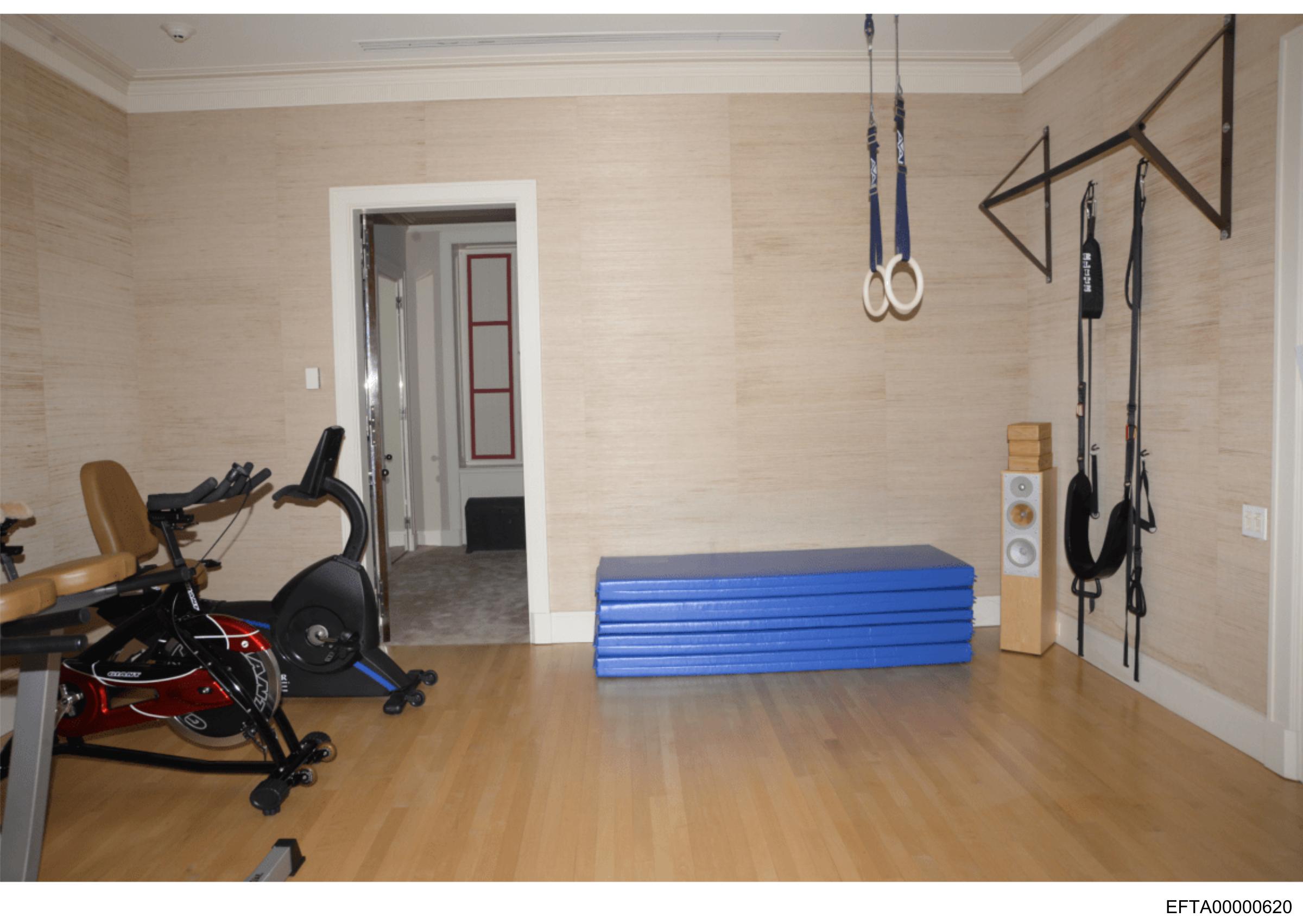 The image shows an indoor gym setting with various exercise equipment and weights.