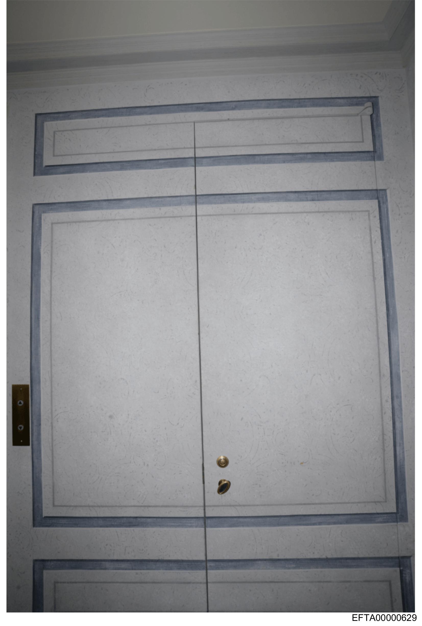 The image depicts a closed door with vertical panels, which appears to be the interior of a residential house or building. The door has a classic design with horizontal grooves and is framed by what looks like painted paneling that matches the color of the door's panels. There are no visible texts, people, or significant objects apart from the door itself. The focus is on the doorway, suggesting an entrance to a room or part of a house not directly visible in the image.