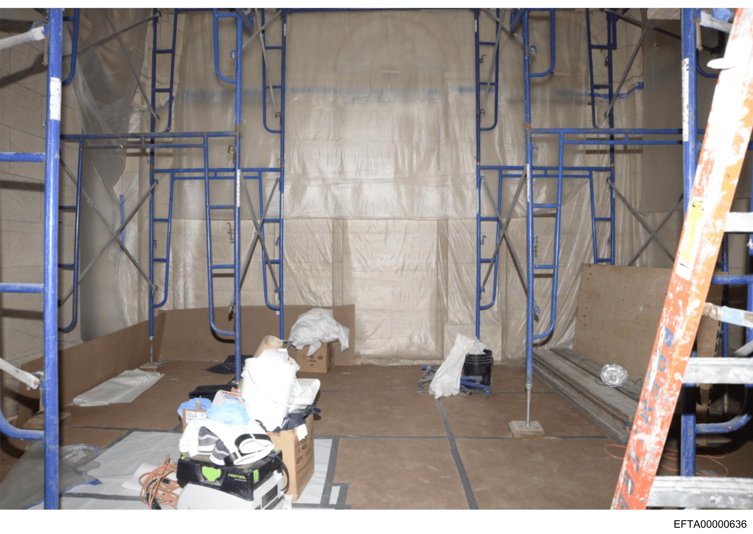 The image depicts an interior space that is under construction or renovation. The room is enclosed by a scaffolding structure, which suggests ongoing work. In the foreground, there are various materials and debris scattered on what appears to be a wooden floor. To the right of the frame, there's a ladder leaning against the wall, indicating access for workers. There is no text visible in the image that can be discerned. The lighting is artificial, which casts shadows on the floor, hinting at the structure and texture of the room being prepared or altered.
