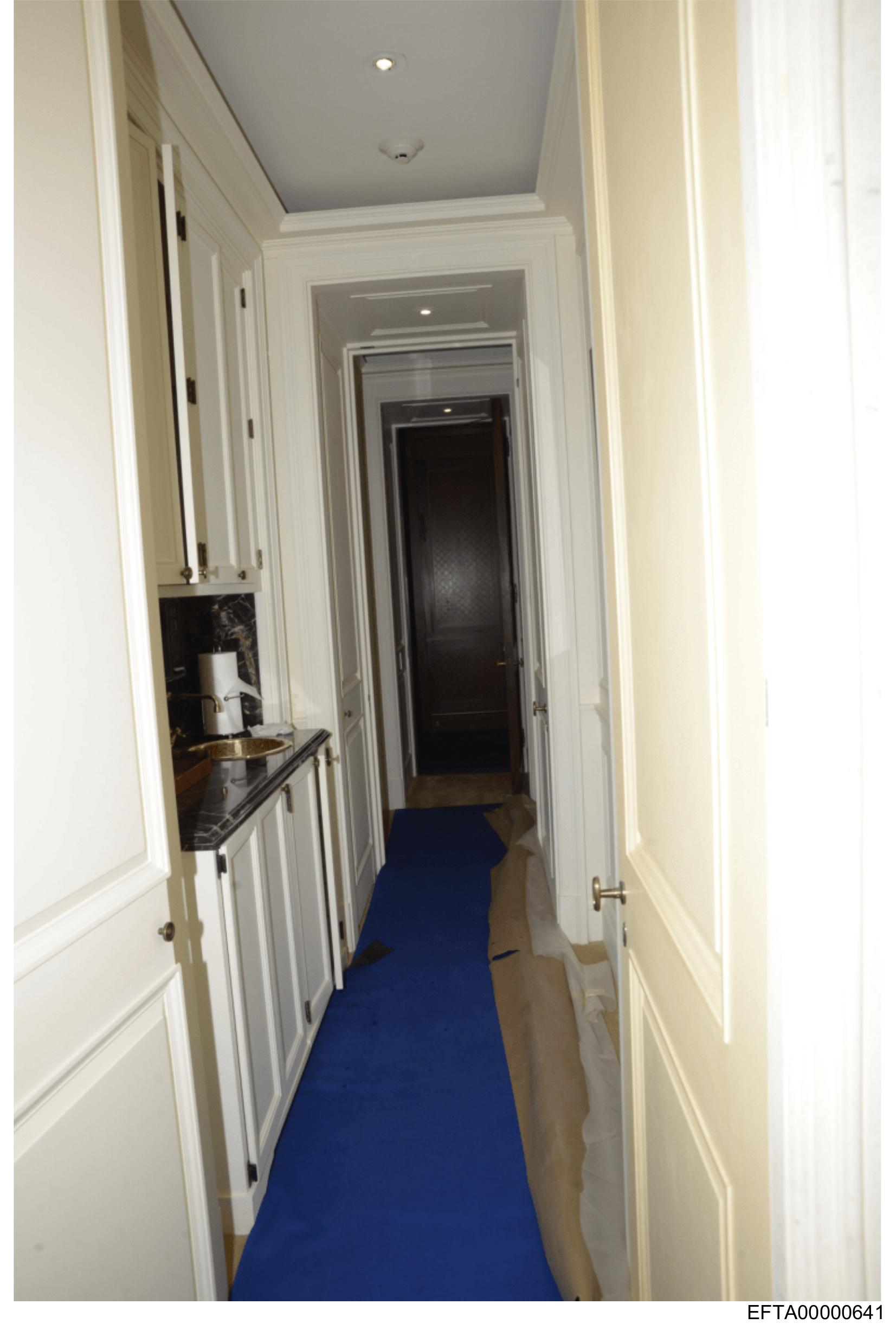 The image shows an interior hallway with walls paneled in wood and a blue runner on the floor leading towards an open door at the end of the corridor.