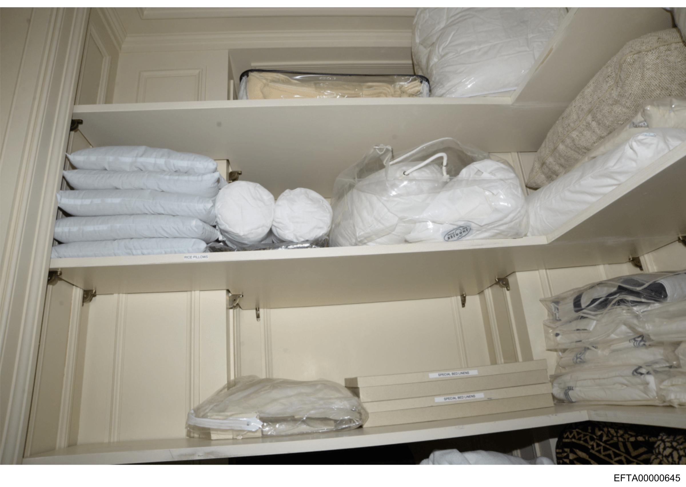 The image shows a storage area with shelves filled with items wrapped in plastic. The shelves are organized into sections, and the contents include what appears to be bedding materials like sheets and blankets. In the foreground, there is one open shelf containing more items not fully visible. The background is less clear due to the focus on the closer objects; however, it seems to be an interior space with additional storage areas or furniture. There are no texts or people discernible in this image.