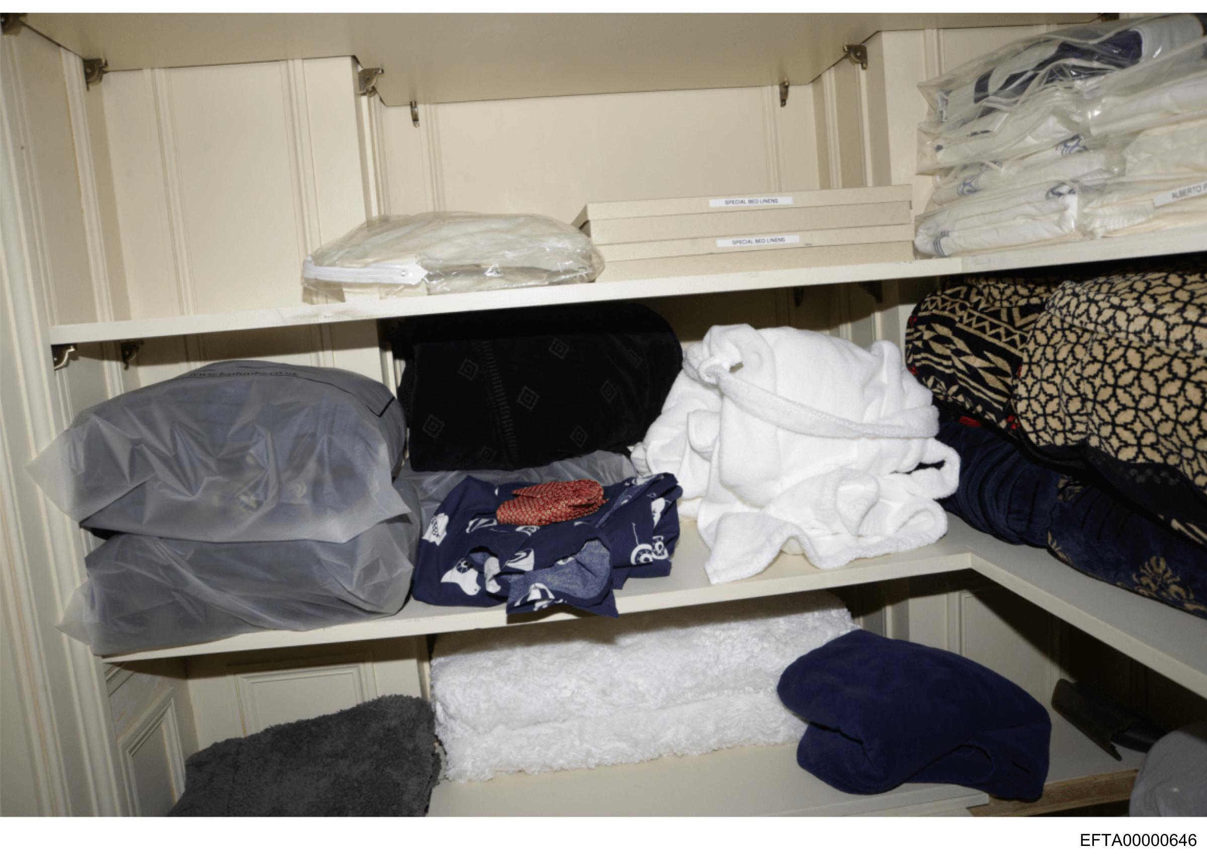 The image shows a well-organized storage room with shelves filled with various items.