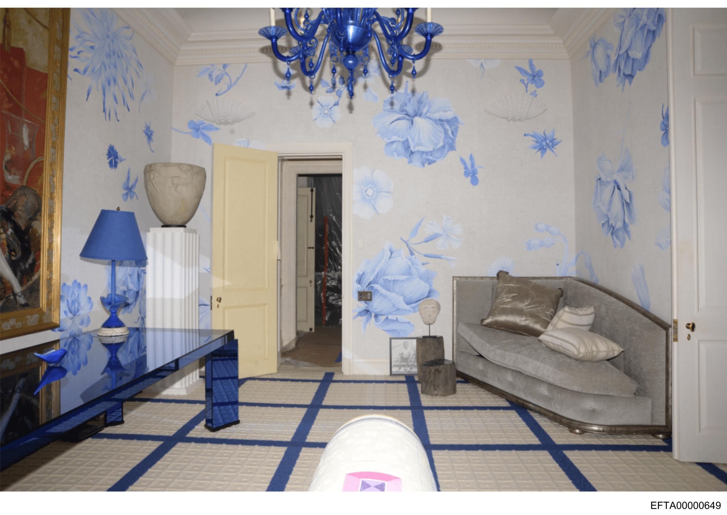 The image shows an interior room decorated with a monochromatic color scheme. The walls are painted in a deep blue hue and adorned with delicate floral patterns in the same color. A chandelier hangs from the ceiling, which is not visible in the photo but inferred by its presence in similar settings. On the left side of the image, there's a white door partially open, leading to another room or hallway. The floor is tiled and reflects the blue of the walls. In the foreground, a vase with a floral arrangement can be seen on a surface, possibly a table or shelf. There are no visible texts, people, or specific locations identifiable from this image.