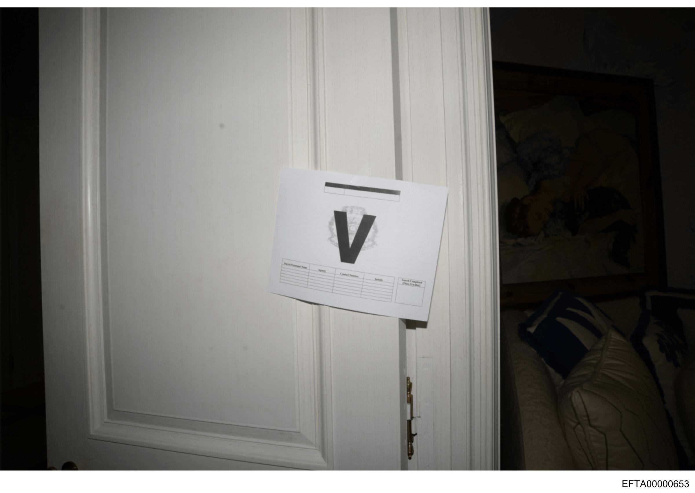 The image depicts a closed door with a piece of paper attached to it by what appears to be transparent tape. The paper has the letter "V" prominently displayed in the center and includes some additional text and numbers that are partially obscured. The door has a rectangular shape, typical for interior doors, and there is a horizontal wood molding above it. On the right side of the image, just below the paper on the door, part of a blue fabric or garment is visible, suggesting that this might be inside someone's home or residence where clothes are kept close to the door. The overall style of the image has a grainy texture and an overlay effect, giving it a somewhat distorted or aged appearance.