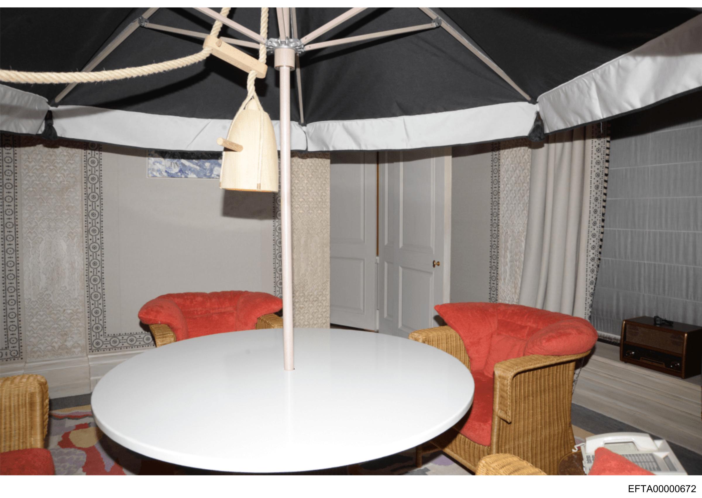 The image captures a cozy indoor space with Asian-inspired decor. In the center stands a wooden table draped with a white cloth, surrounded by several cushioned chairs in vibrant red and orange tones. Above the table, a light fixture with a circular base adds to the warm ambiance of the room. The walls are adorned with panels featuring intricate designs, enhancing the room's cultural appeal. A notable detail is a small door situated in one of these panels, suggesting access to another area or simply serving as an aesthetic element. The overall atmosphere appears inviting and carefully curated.
