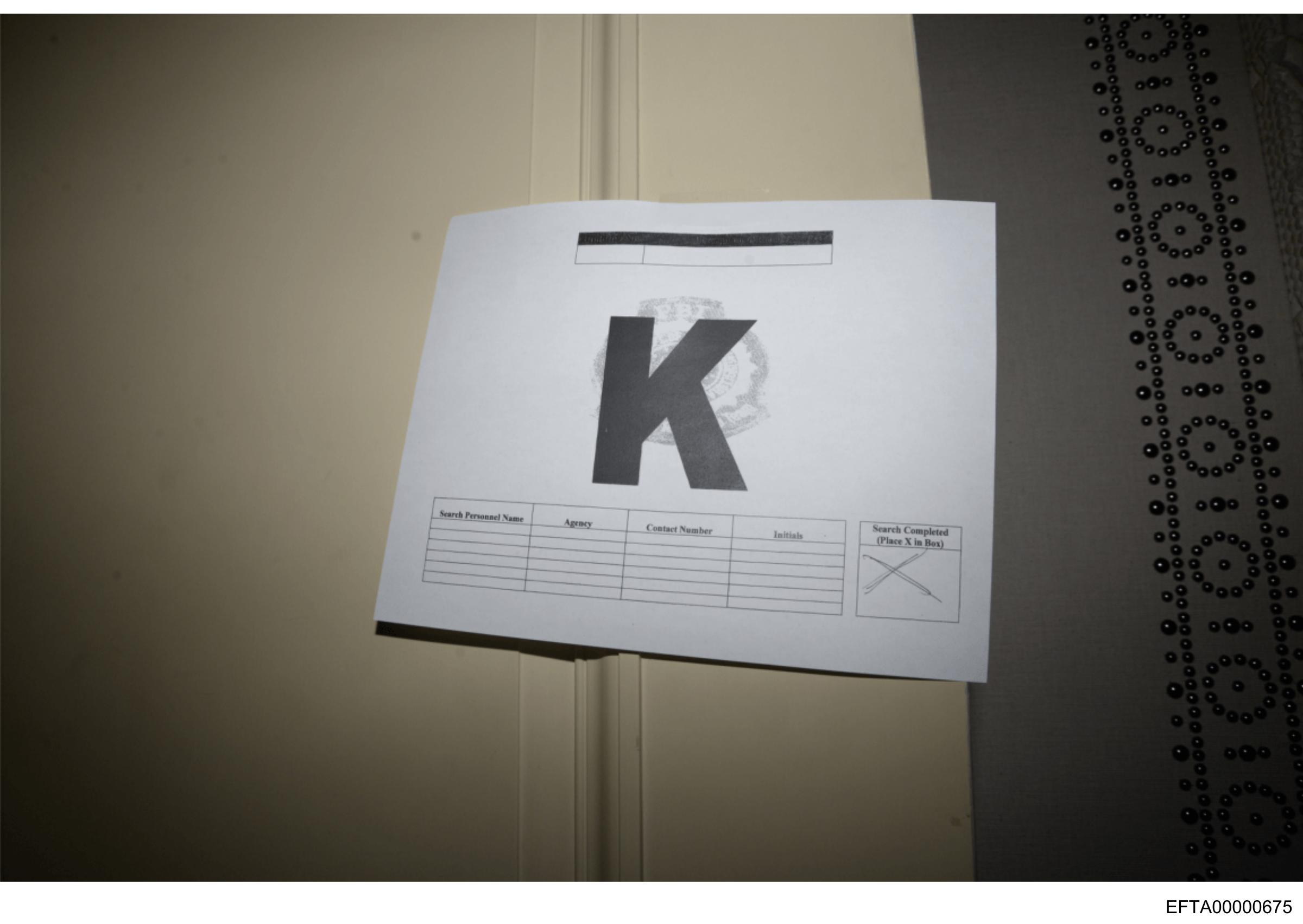The image shows a piece of paper attached to what appears to be a door frame or partition. The paper features large black letters spelling out "K" with additional smaller text and numbers beneath it, but the content is not clear due to the resolution. There's also an illegible symbol or drawing at the top right corner of the paper. In the background, part of what looks like a curtain or drape can be seen, along with a patterned surface that might be carpeting. The lighting in the room seems dim, suggesting either nighttime or a poorly lit interior.