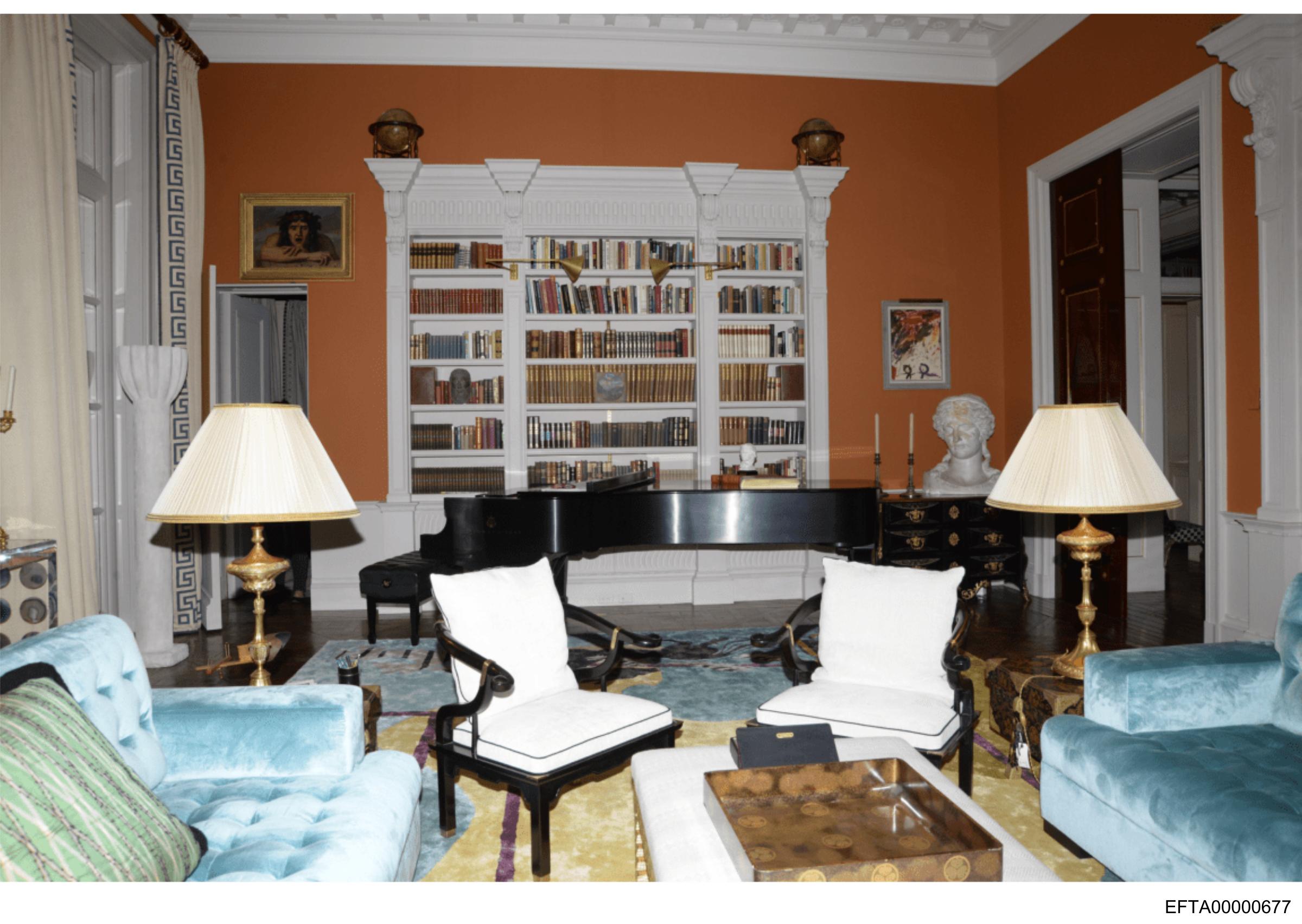 The image depicts a large living room with classic decor. Dominating the background is a wall of bookshelves filled with books and various decorative items. Above the bookshelves, there's a fireplace mantel adorned with artworks and a mirror above it. A grand piano sits in front of the bookcase, indicating a space for music and leisure. In the foreground, comfortable seating is arranged around a central area rug. Two armchairs flank a blue sofa, which has cushions on it. There's an ottoman with what appears to be a blanket or folded fabric draped over one end. To the left of the frame, there's a tall floor lamp providing ambient lighting. The walls are painted in a warm tone, and the room is illuminated by natural light coming from windows that are not visible in this image. There's no text present in the image, and no people or distinctive locations can be identified within this particular scene. The style of the furniture and decor suggests an older, possibly Victorian or Edwardian era design influence.