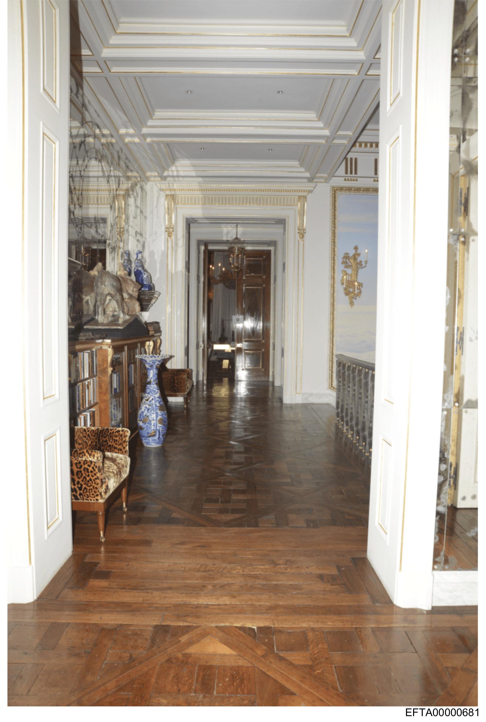 The image depicts an interior hallway with a luxurious and grand design, indicative of a high-end residence or establishment.
