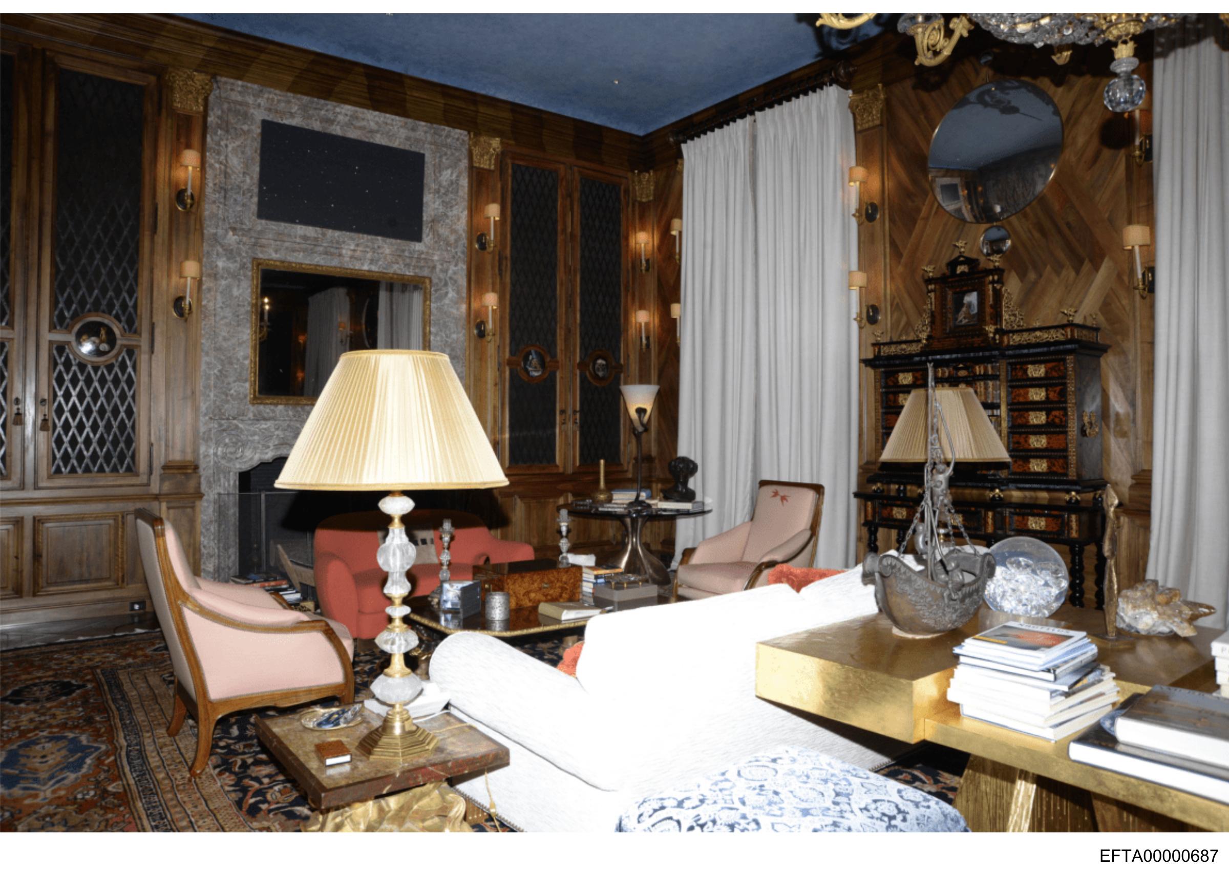 The image shows an interior room that appears to be a vintage living room or study. The room is furnished with classic pieces, including a large armchair with a floral pattern, a smaller chair, and a desk against the wall. There are books on top of the desk, suggesting a reading or work area. On the wall above the desk hangs a mirror framed in an ornate style, reflecting part of the room's decor. The walls have decorative wallpaper and there is a fireplace with a carved mantel at one end of the room. A large window adorned with curtains allows for natural light to enter, while sconces on either side of the door provide additional lighting. There are no visible texts or people in the image. The location seems to be a residential setting rather than an institutional one due to the personal items and furnishings. The style of the room suggests a design from the late 19th to early 20th century, which is evidenced by the architectural details and furniture styles.