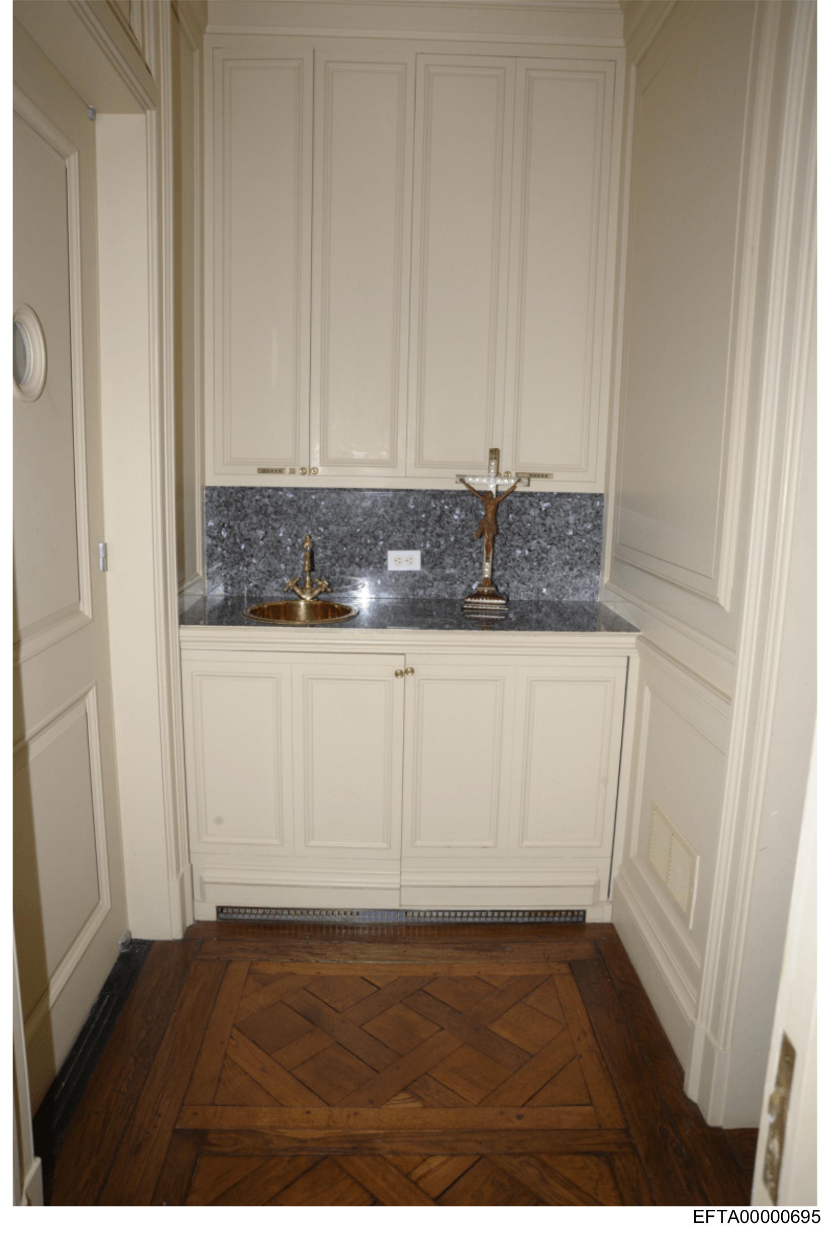 The image displays an interior space that appears to be a corner of a room with architectural features indicative of traditional design. A cabinet with doors occupies the space, set into a wall paneled with what looks like wood veneer. Above the cabinet, there is a shelf or ledge, and above that, decorative elements resembling crown molding or cornicing are visible, contributing to an elegant, classic aesthetic. The flooring has a pattern that suggests it might be parquet, which adds to the room's vintage charm. There are no texts, people, or other identifiable locations in the image. The style of the photograph is straightforward and seems to have been taken with the intention of showcasing interior design elements, possibly for real estate, renovation inspiration, or as part of a portfolio.