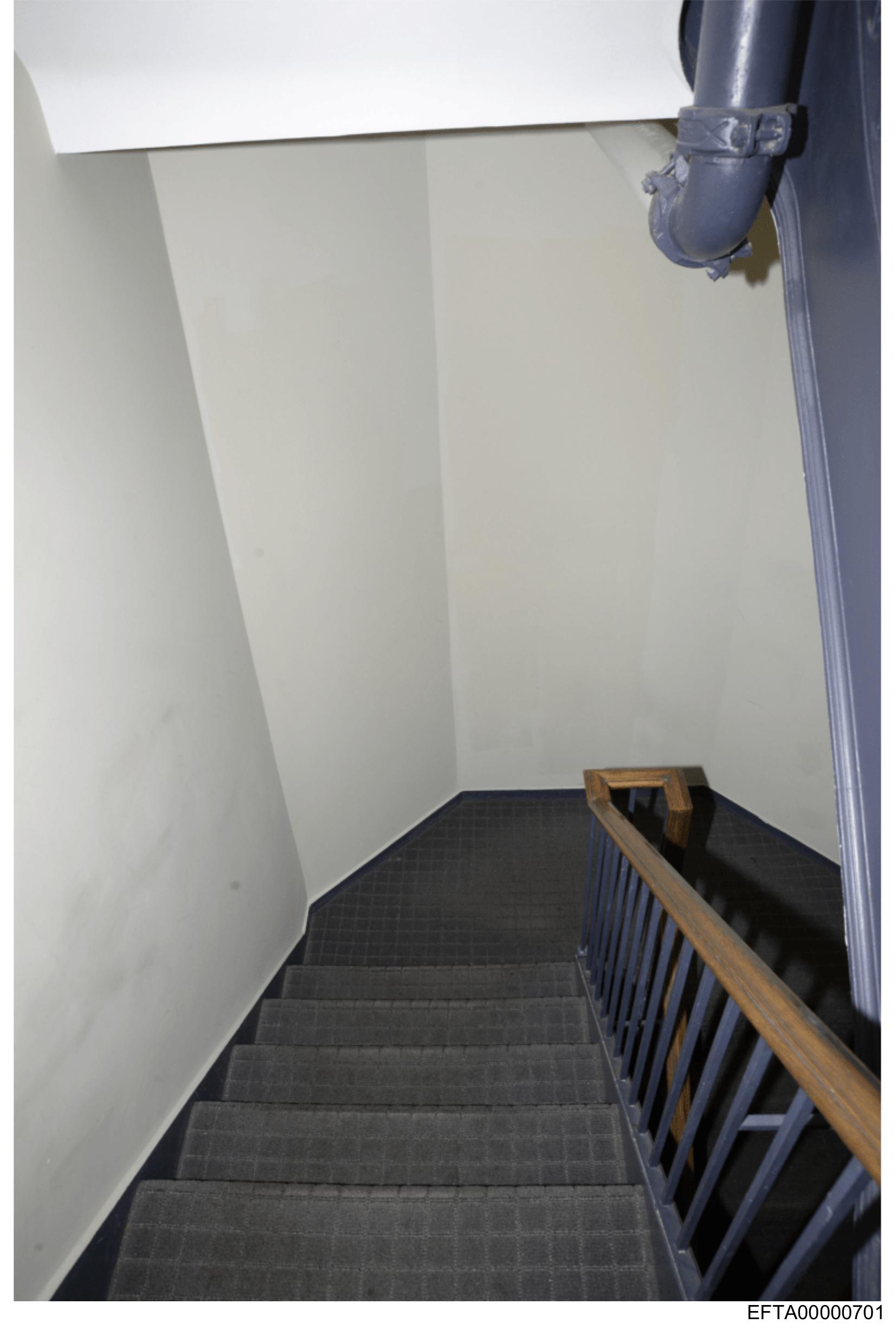 The image shows an interior stairwell with concrete steps and a wooden handrail on the right side.
