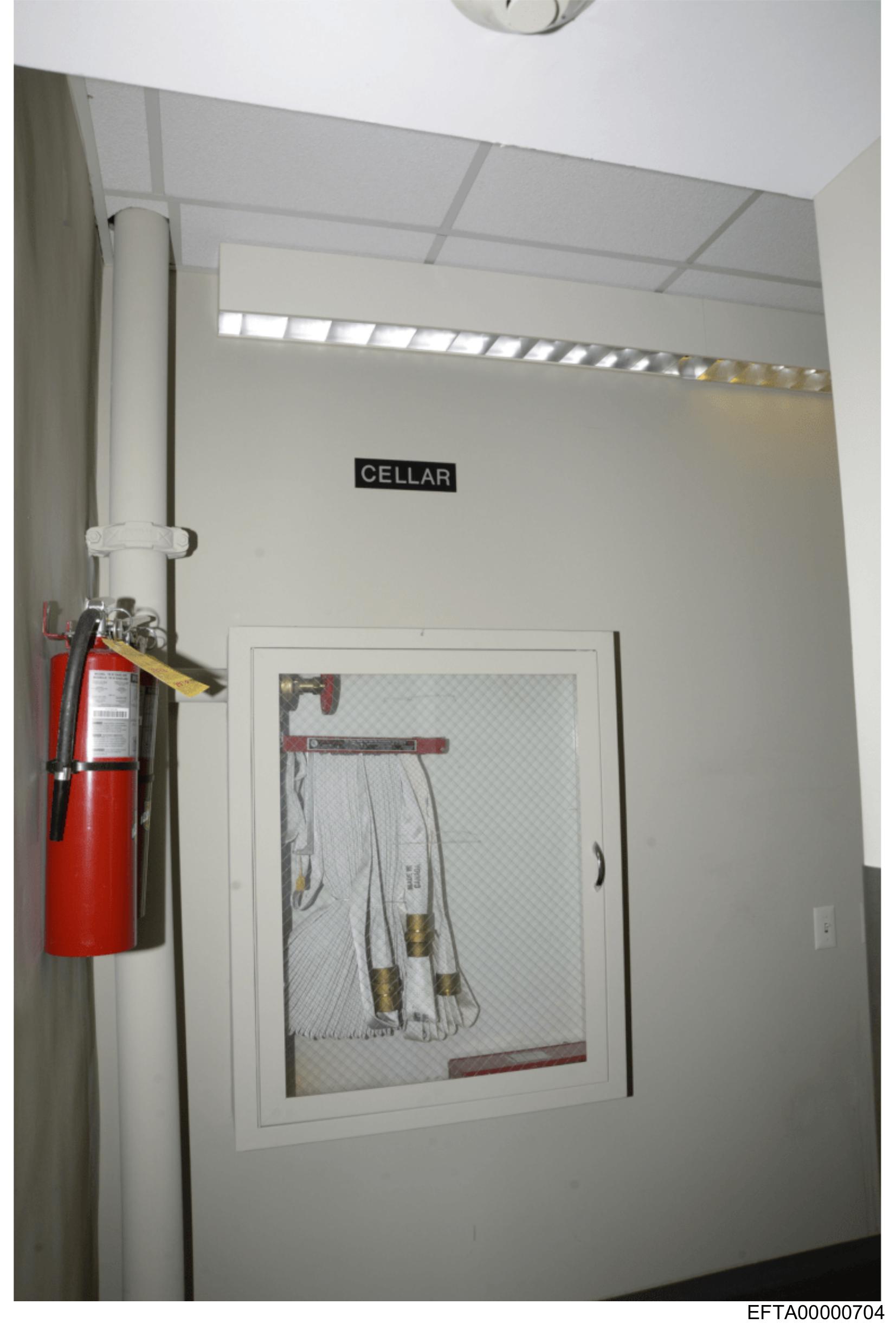 The image depicts an indoor setting with a focus on a structure labeled "CELL" with bold letters. The door of the cell is open, revealing its interior, which includes what appears to be equipment such as wires and cables. To the right of the cell, there's a fire extinguisher mounted on the wall, indicating safety precautions in place. The ceiling has visible fluorescent lights providing illumination. In the foreground, there are partial outlines suggesting other objects or structures, but they are not clearly identifiable. There is no visible text that provides additional context or information about the location of this cell.