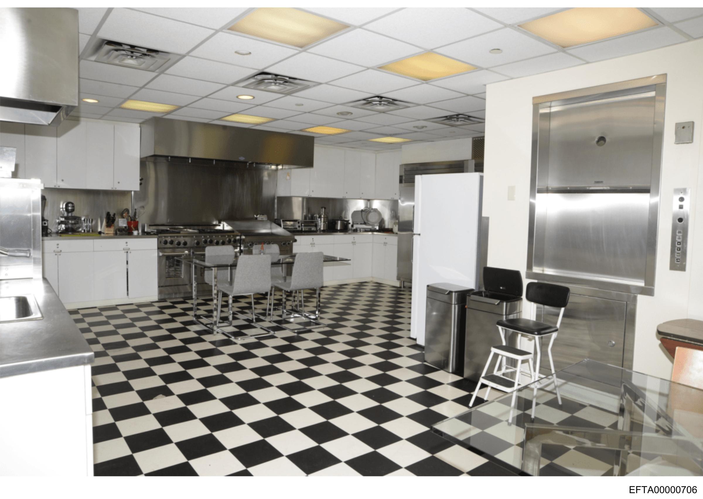 The image depicts an industrial kitchen with stainless steel appliances and white cabinets on the walls.