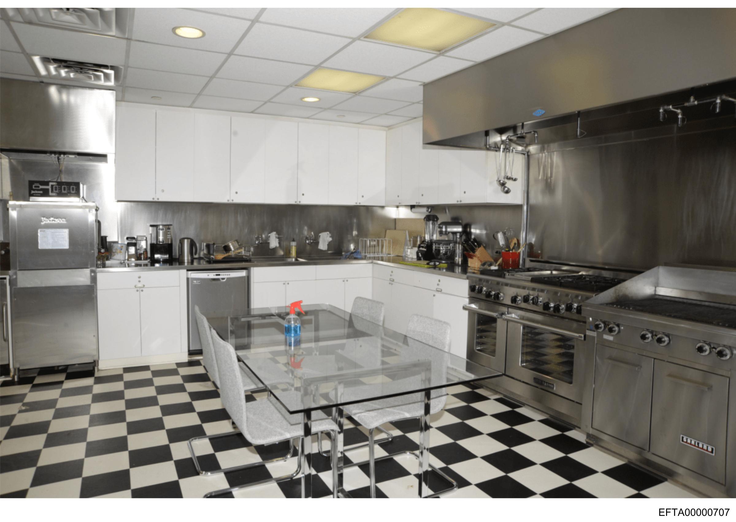 The image shows an industrial kitchen with a black and white checkered floor that contrasts with the stainless steel appliances.