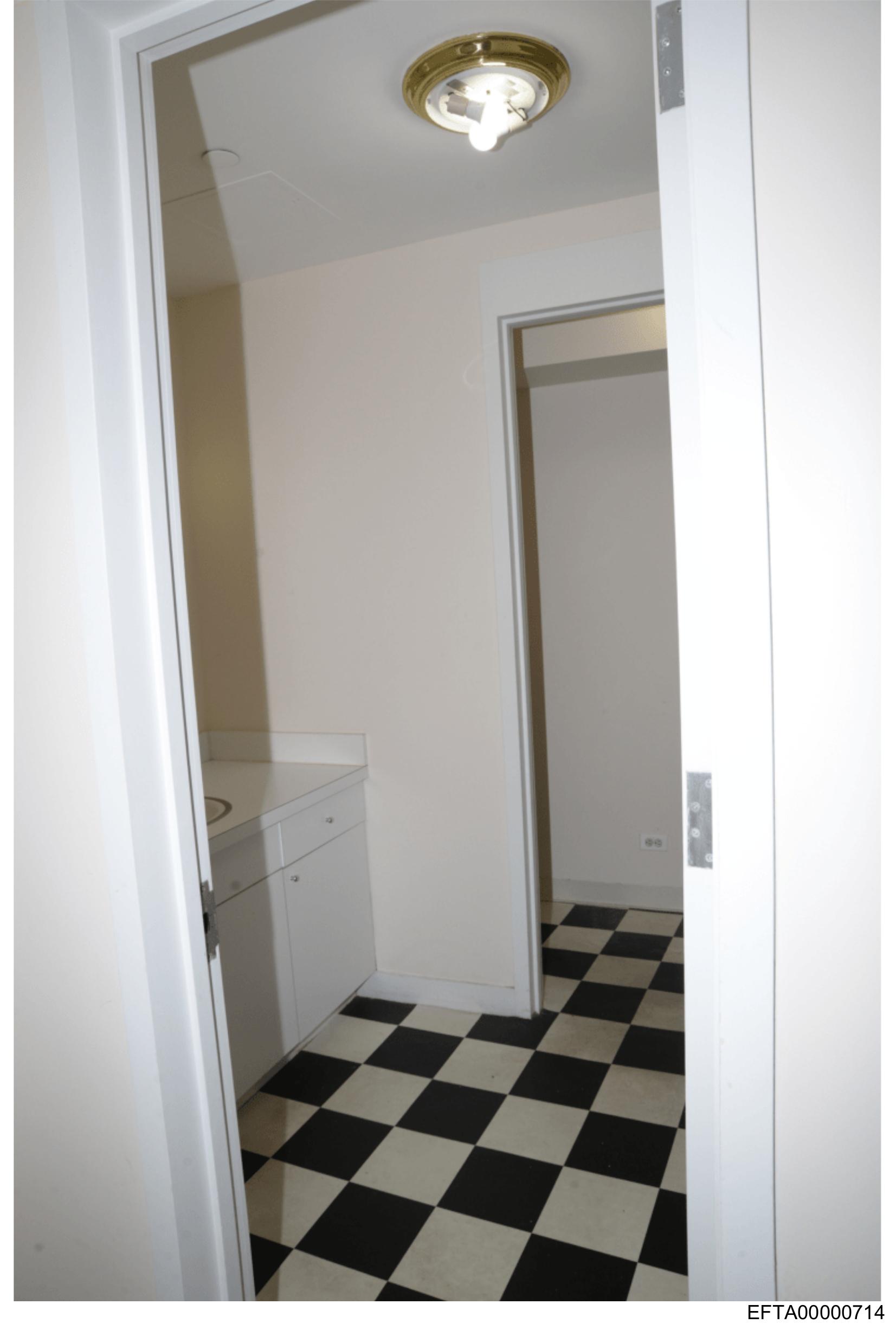 The image shows a small room with black and white checkered flooring that extends to the left wall.