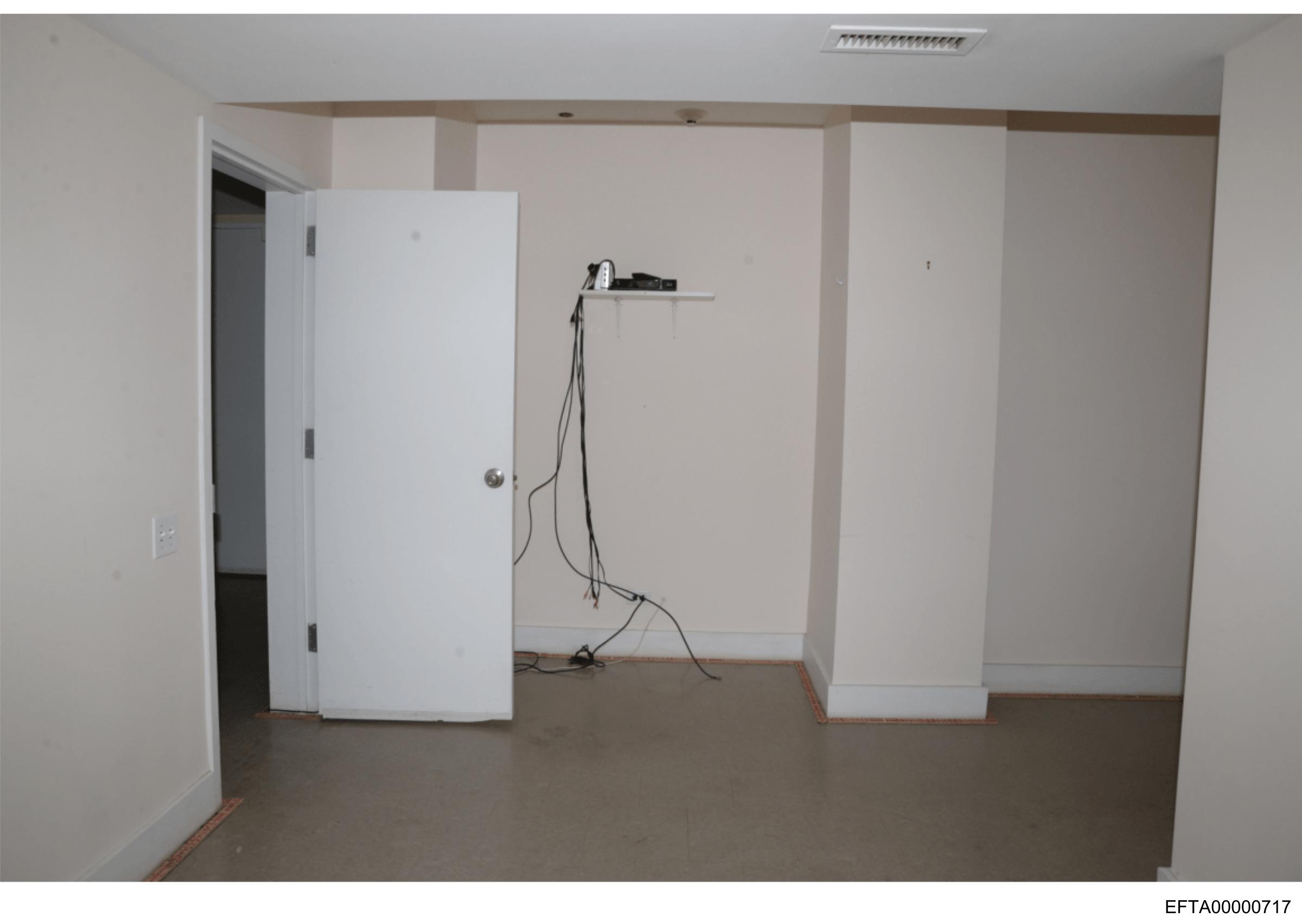 The image shows an interior space that appears to be under construction or renovation. There is no furniture visible, and the walls are unfinished with exposed studs and insulation. The flooring looks like it might be concrete or a similar material. A white door can be seen on the left side of the room, partially open. Various cables are strung across the space, including what appears to be black electrical wiring. There is no text present in the image. The style of the image suggests that it may have been taken with a smartphone or casual camera due to its informal and unpolished appearance.