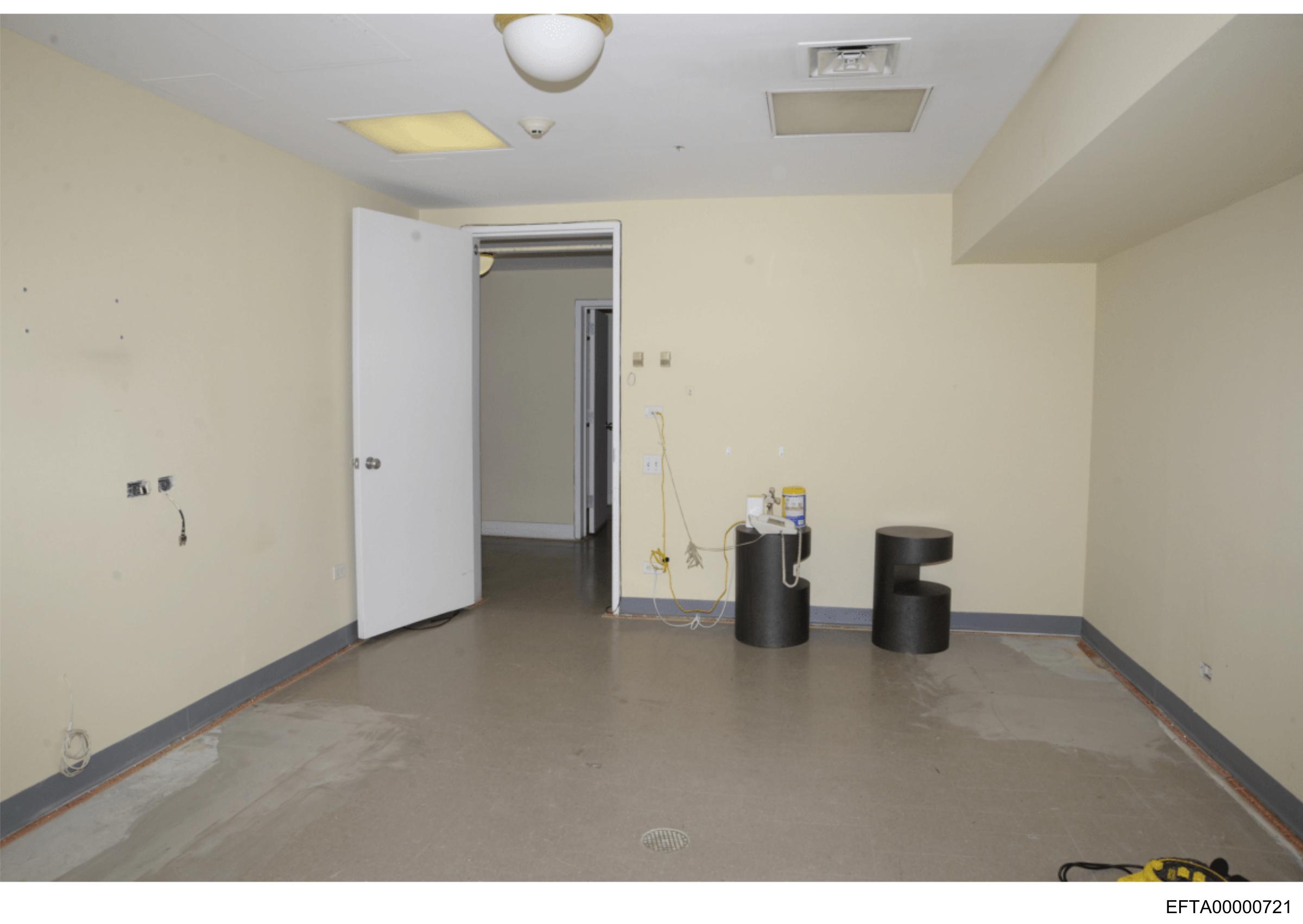 The image shows an interior space that appears to be a room under construction or renovation. The walls are unfinished and there's exposed insulation on the ceiling tiles. In the center of the room is what looks like a large black object with handles, possibly some form of machinery or equipment. There are wires and cables running along the floor and the far wall features an open doorway leading to another room that is not fully visible in the image. The text "ETX" followed by a series of numbers "092107" can be seen on the lower left side, which might refer to identification or inventory information related to the equipment or room.