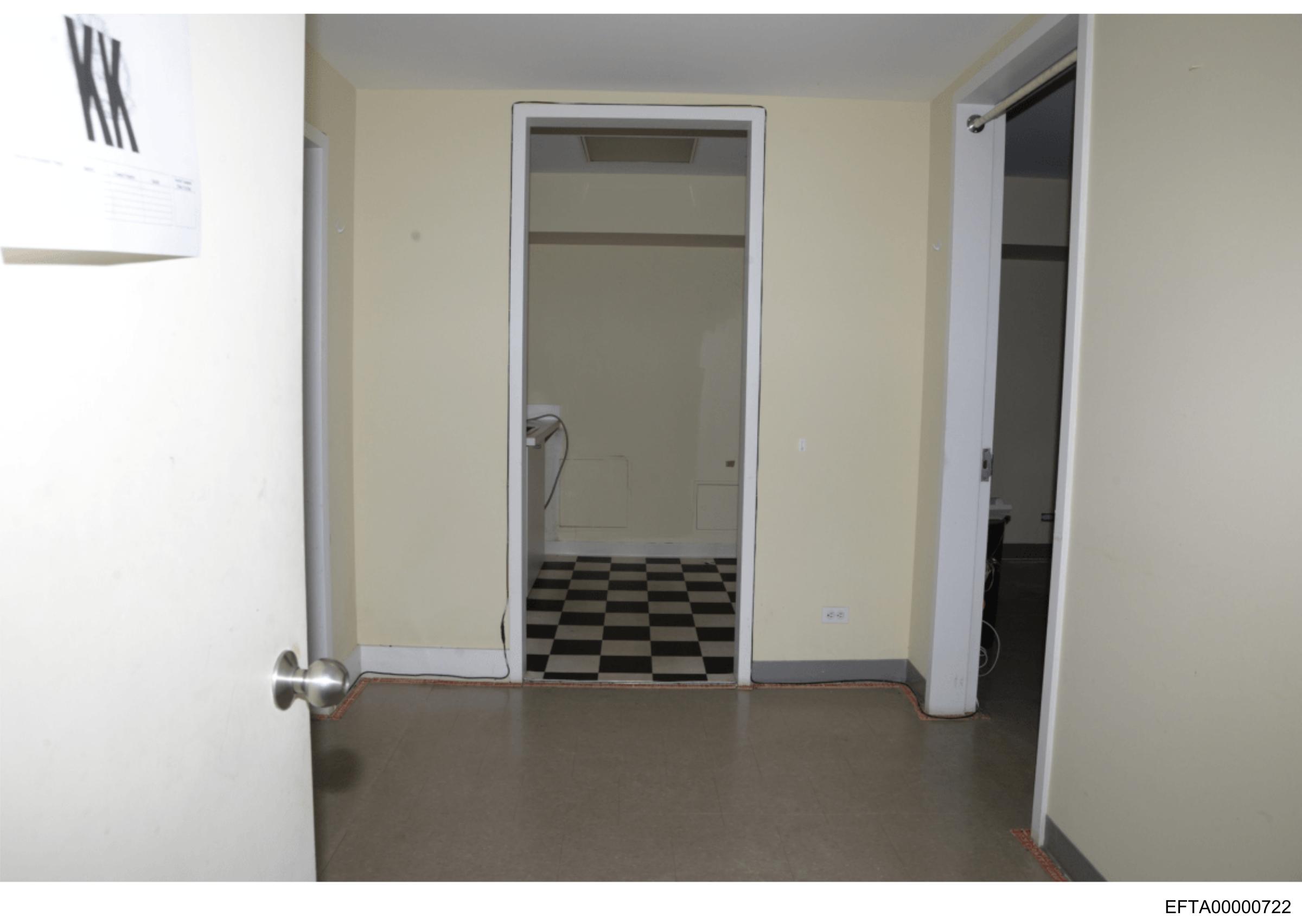This is a photograph of an interior space that appears to be an empty room with closed doors on the left wall. The floor is covered by what looks like linoleum in shades of brown and tan, featuring a checkered pattern at some points. On the right side of the image, there's a doorway leading to another room, where only the upper part of the interior can be seen due to the perspective angle. In the corner of the frame, there is a watermark or overlay text that reads "ETRX0182," which could suggest a file name or reference number associated with this image. The overall style of the photograph has a grainy texture and low saturation, giving it an aged or distressed look.