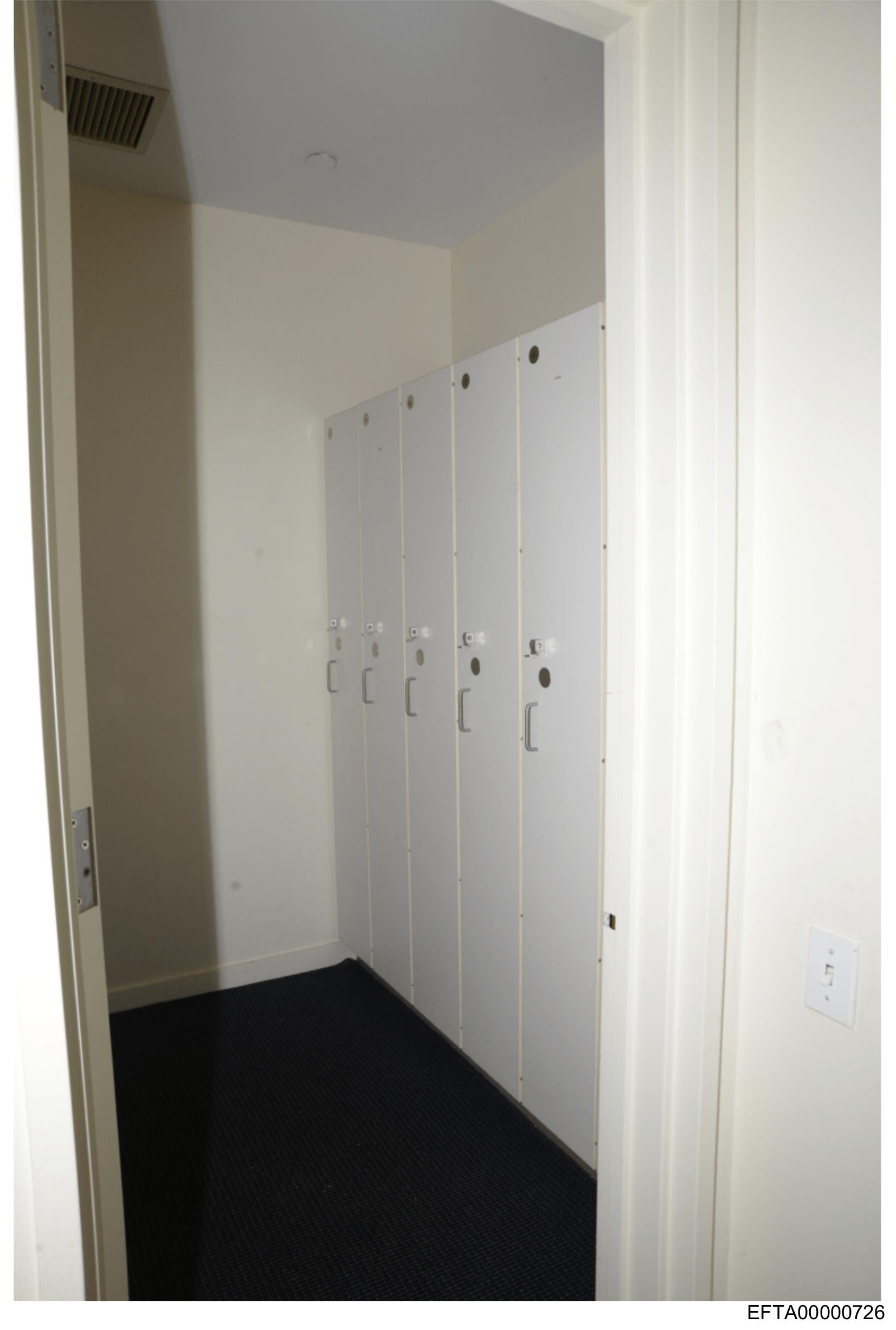 The image shows an interior view of a room with multiple white lockers arranged in rows along one wall.