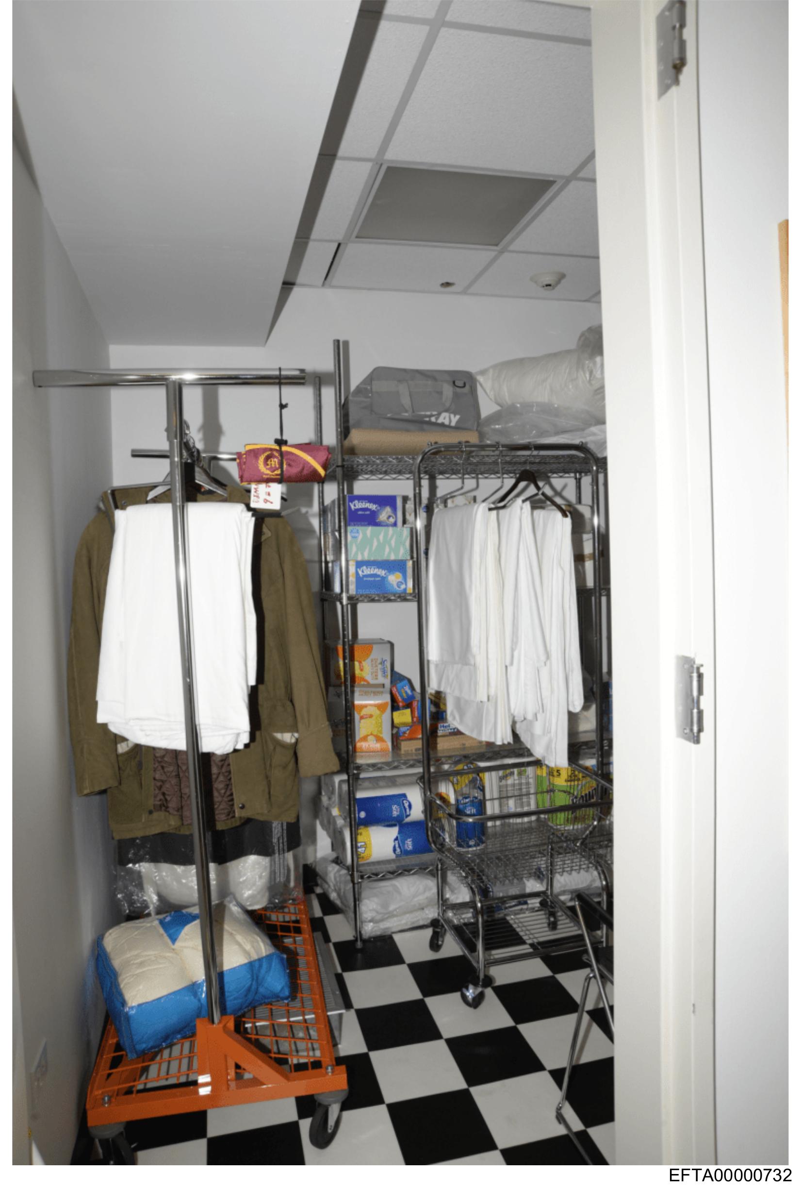 The image shows an interior space that appears to be a storage room or closet. There is a metal rack filled with various items, including clothing and what looks like cleaning supplies in bags. On the floor to the right, there are more bags and possibly boxes, suggesting this is a room used for storing belongings or materials rather than being a residential closet per se. The wall has a textured surface, typical of many interior walls, and there's an air vent visible near the top. The flooring is patterned with alternating black and white tiles.