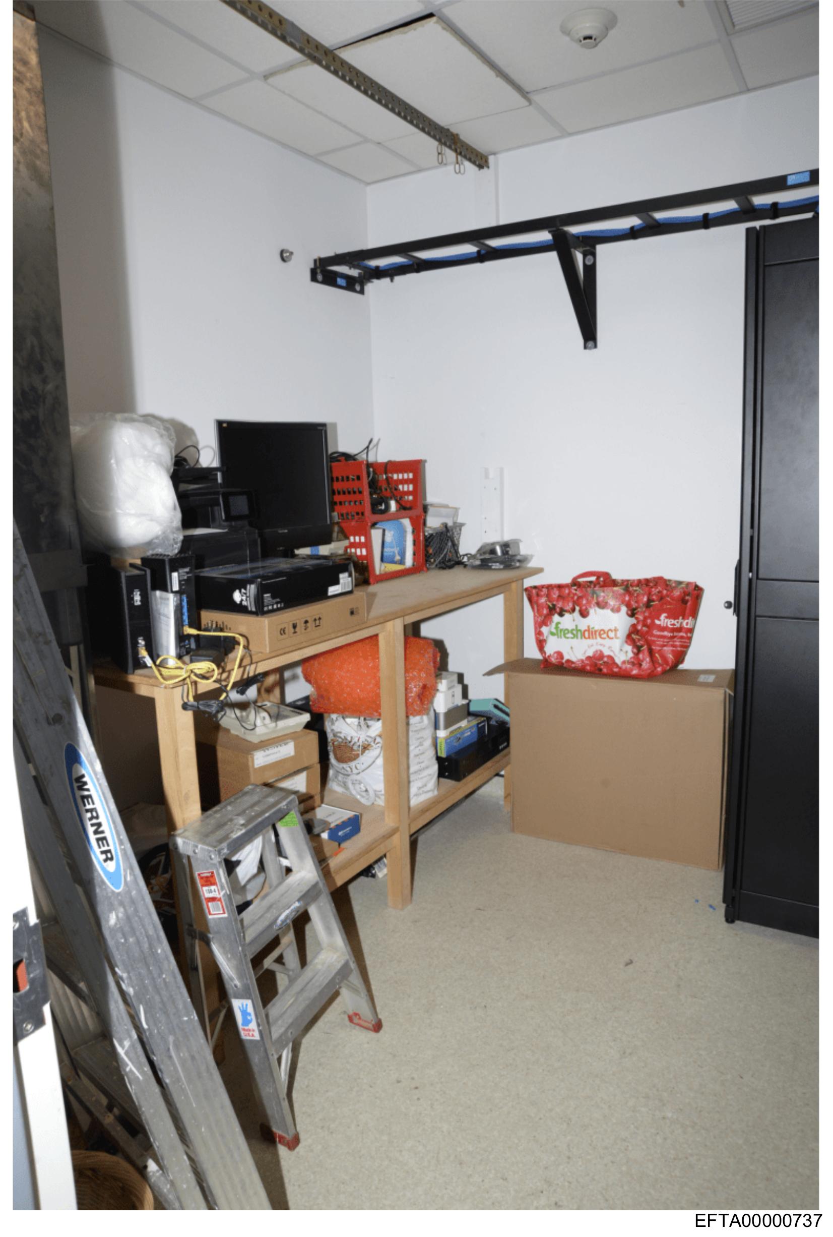 This is a photograph showing an indoor room with various items scattered around. The room appears to be somewhat cluttered, with boxes and what looks like a computer setup on the left side. There's also a large item wrapped in white plastic against the wall. On the right, there's a closed door with a sign that is too small to read clearly, but it seems to contain text. A ladder leans against one of the walls, and there are tools or equipment stacked nearby. The room has fluorescent lighting fixtures overhead. There are no visible people in the image.