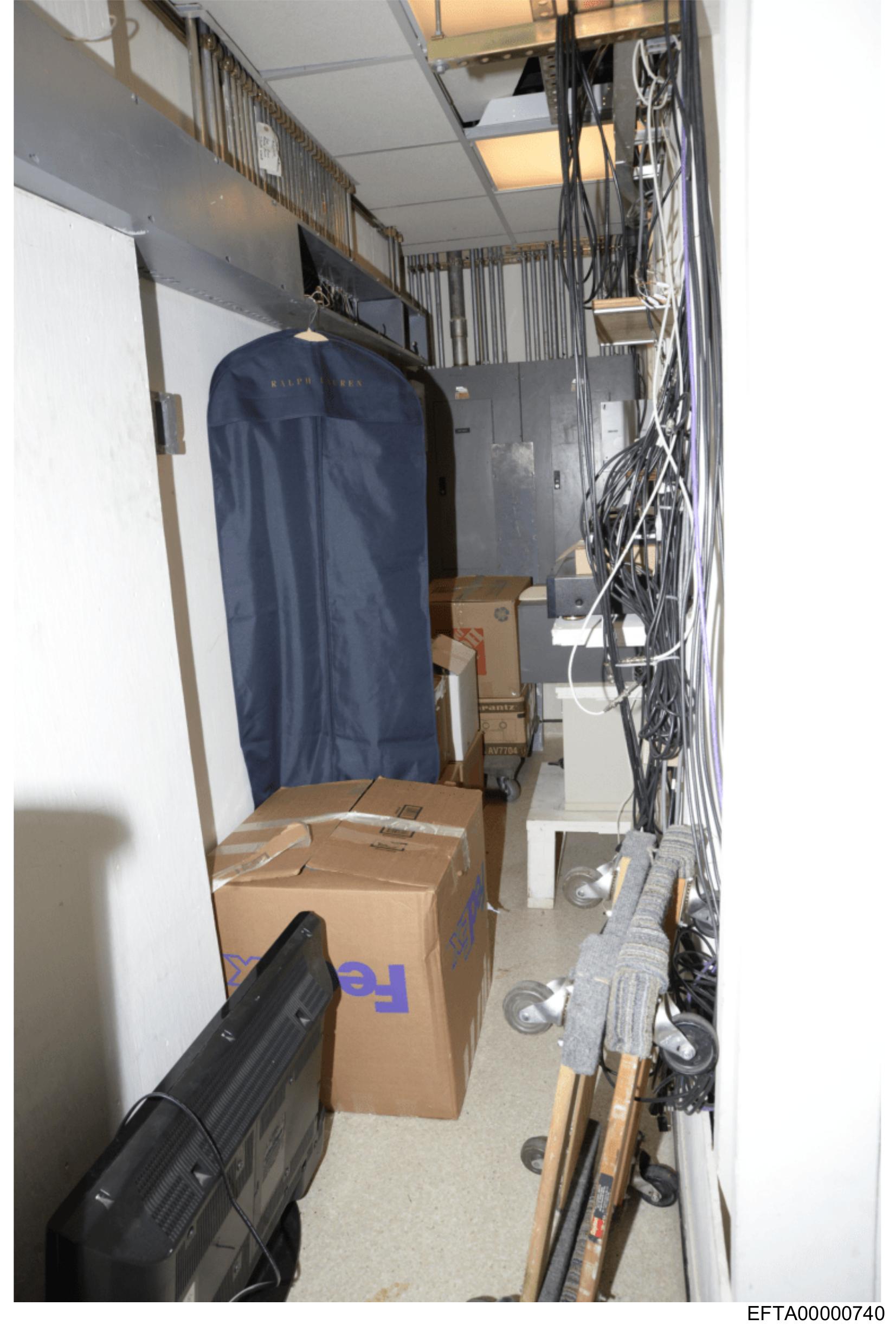 The image shows the interior of a space that appears to be under construction or in a state of transition. In the foreground, there are multiple cardboard boxes stacked on top of each other, with a black screen or piece of equipment partially visible behind them. The room has exposed wiring and conduits running along the walls and ceiling, suggesting ongoing electrical work. There is also what looks like a wooden pallet or platform to the left side of the image. In the background, there's a blue curtain that might be used as a temporary wall partition. The lighting in the space seems artificial, casting shadows on the floor. No people are visible in the image.