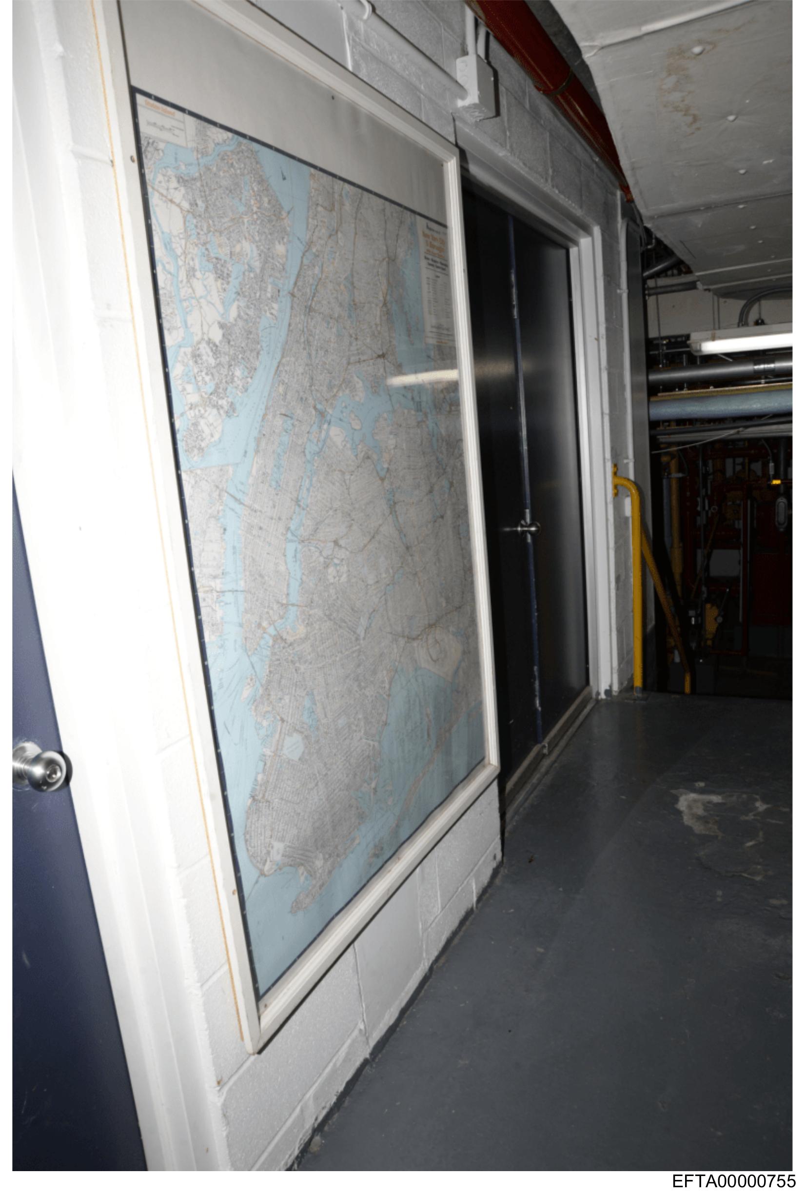 The image shows an interior space with a focus on a door frame featuring a map. The map is framed and appears to be of the region surrounding New York City, given the layout and labels indicating bodies of water such as the Hudson River and Long Island Sound, along with various municipalities. The door itself is partially visible, with what seems to be some kind of access badge holder attached to it. The room has a utilitarian look, indicated by a concrete floor and tiled walls. There is no text or people present in the image. The photo has been taken at an angle, giving a sense of depth as the door frame leads the viewer's eye into the room beyond.
