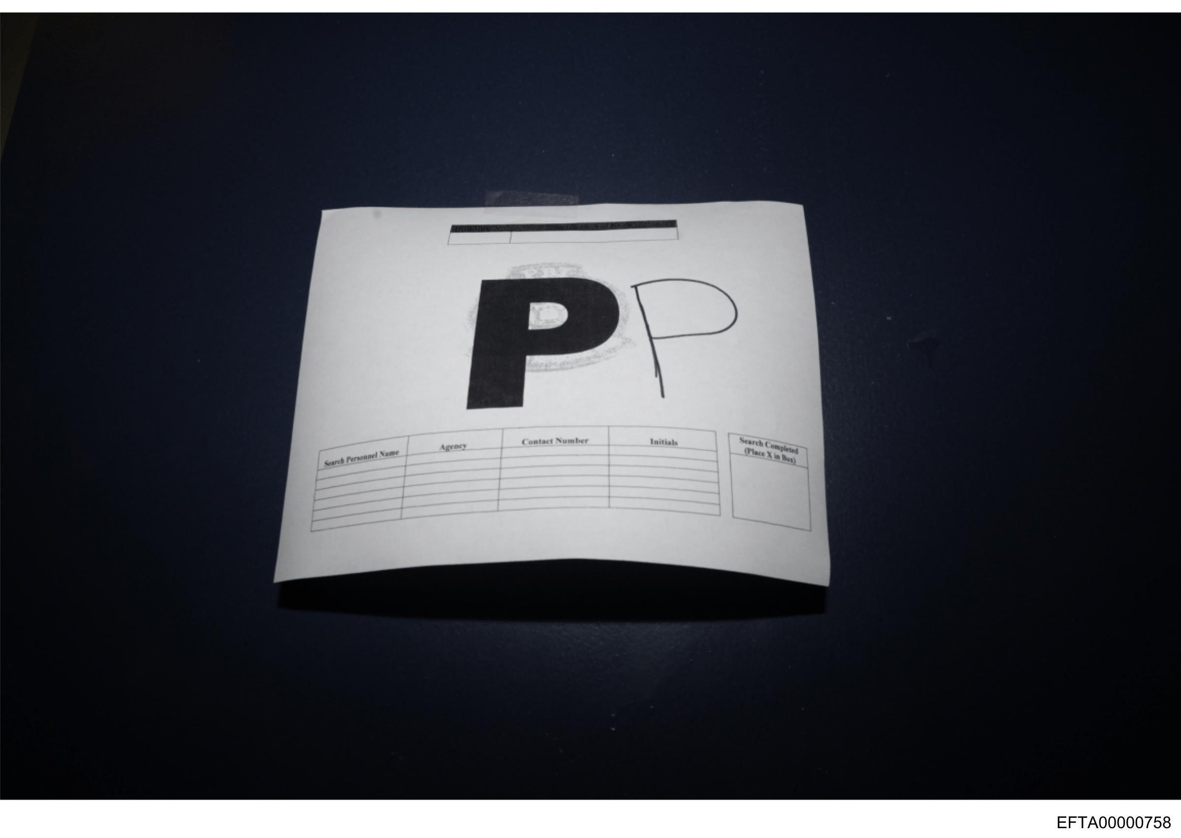 The image is a close-up of what appears to be an envelope lying on a flat surface. The envelope has the letter "P" prominently displayed in the center. There are also some faint lines and words visible around the edges, but they are not clearly legible due to the angle and focus of the photograph. The background is indistinct, which emphasizes the central object.