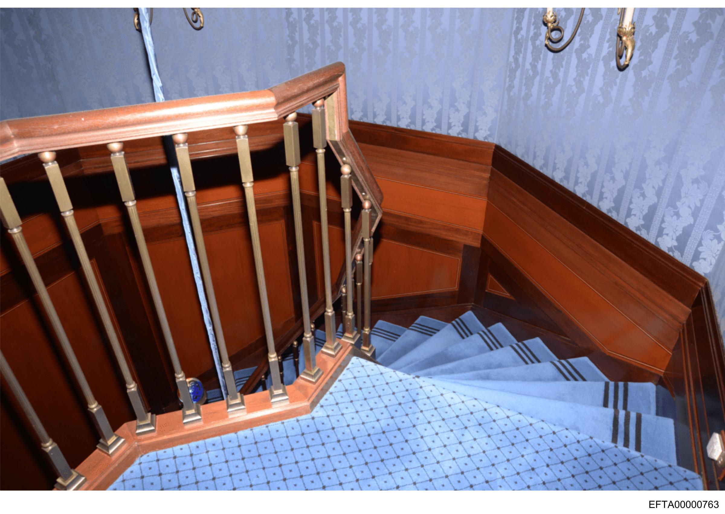 The image shows a staircase with wooden banisters and a metal railing on the right side.