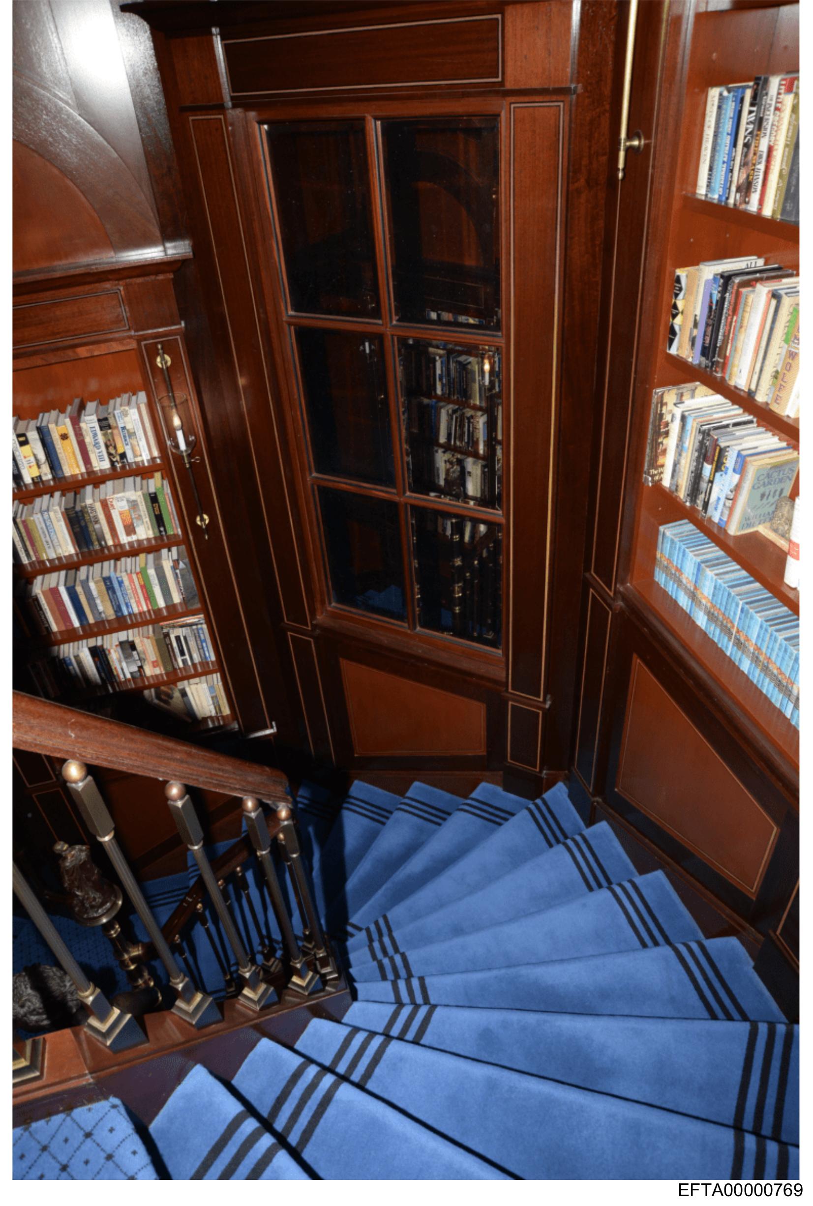The image shows a staircase leading upwards. The stairs have dark railings and are adorned with blue carpeting that has a pattern of lighter stripes running along the sides of each step. On either side of the staircase, there are bookshelves filled with numerous books, creating an impression of a well-stocked library or study area. The walls surrounding the staircase appear to be made of dark wood, and there is a window visible above the stairs. There is no text present in the image.