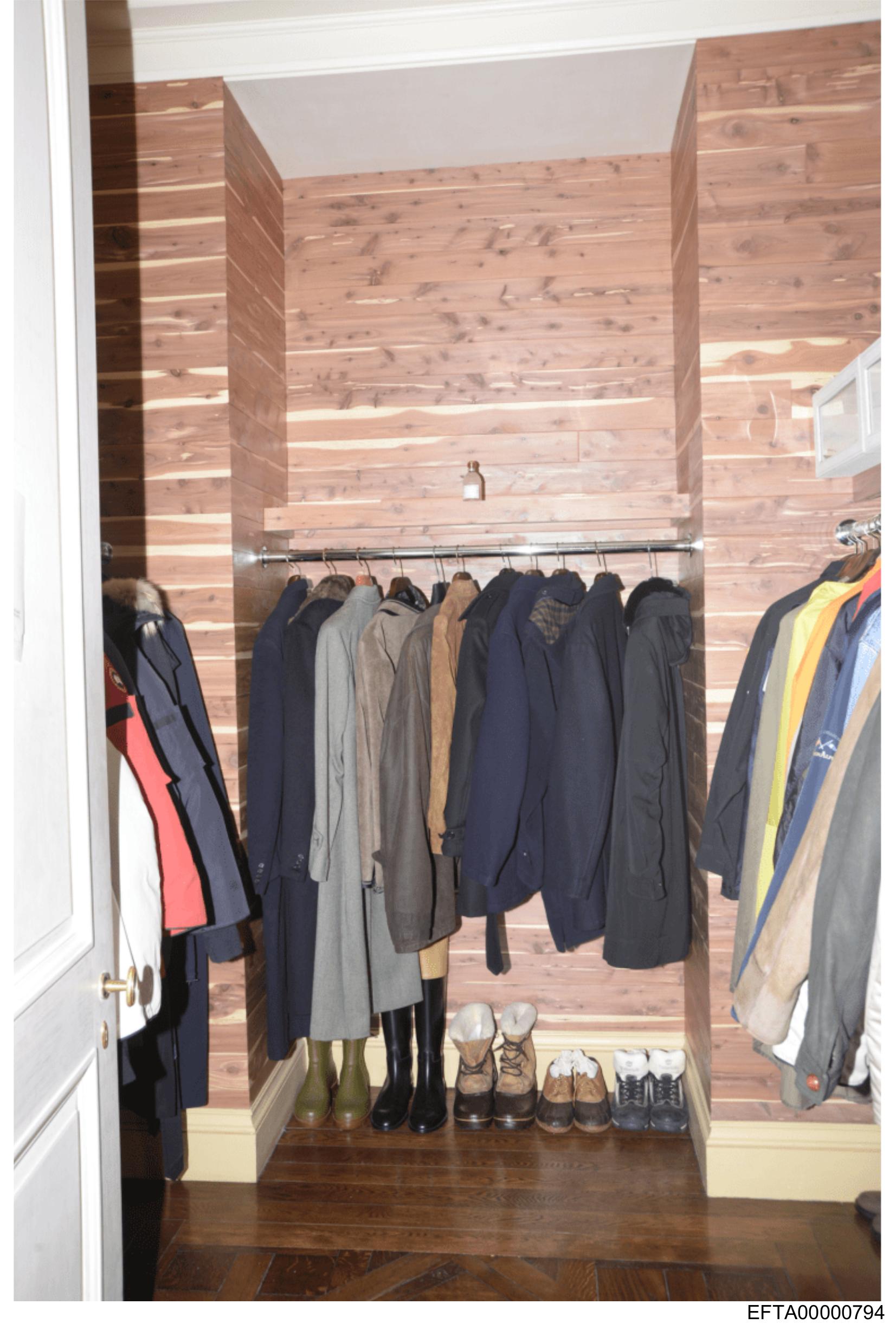 The image shows a closet with hanging clothes and storage shelves. There are multiple hangers supporting various items of clothing. The interior of the closet features wooden paneling on the walls, which gives it an aesthetic appeal. The floor is not clearly visible due to the angle and perspective from which the photo was taken. The lighting in the room appears to be natural, suggesting a daytime setting. There are no texts or identifiable brands in the image.