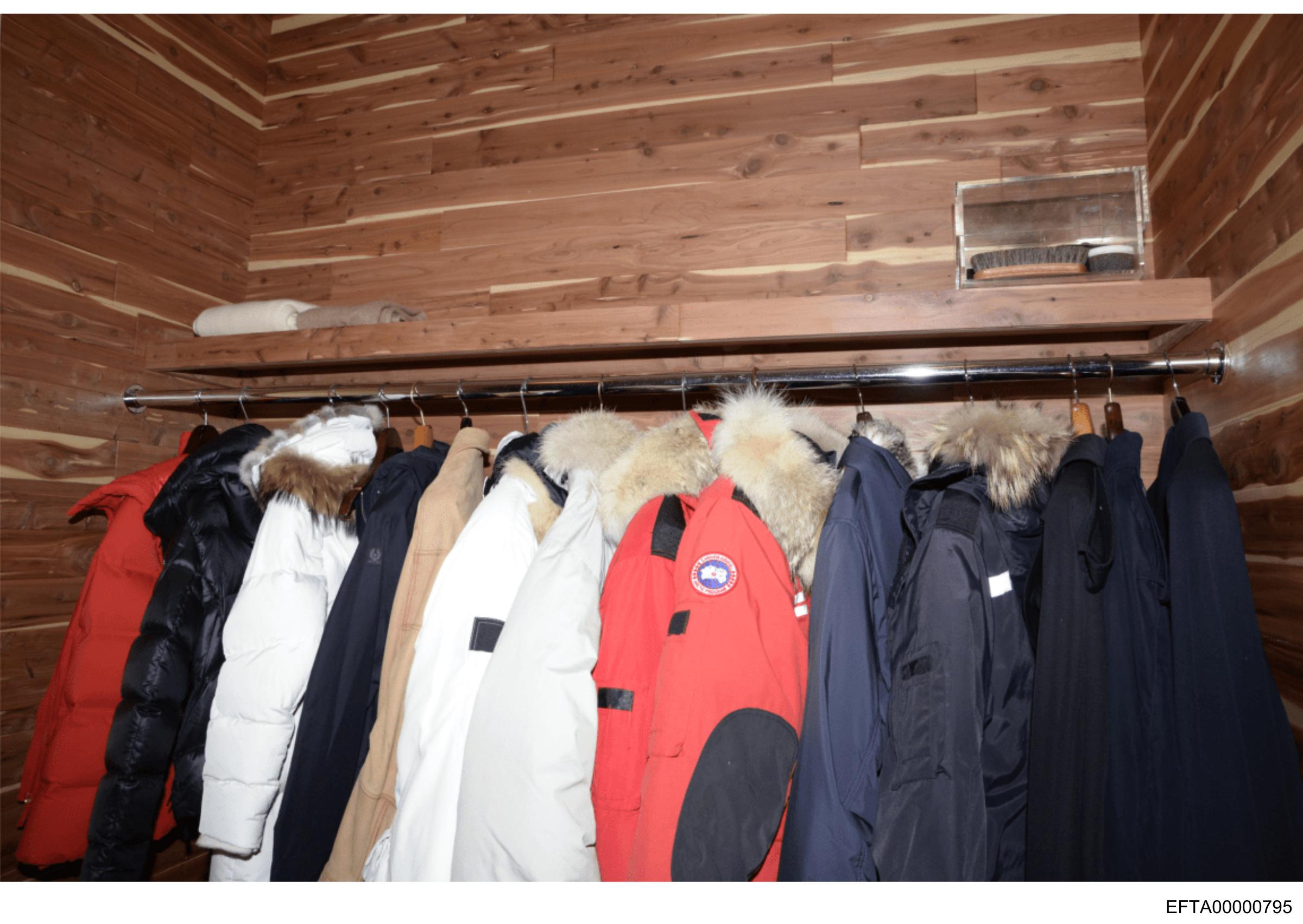 The image shows a collection of coats hanging on a rack inside what appears to be a rustic wooden cabin.