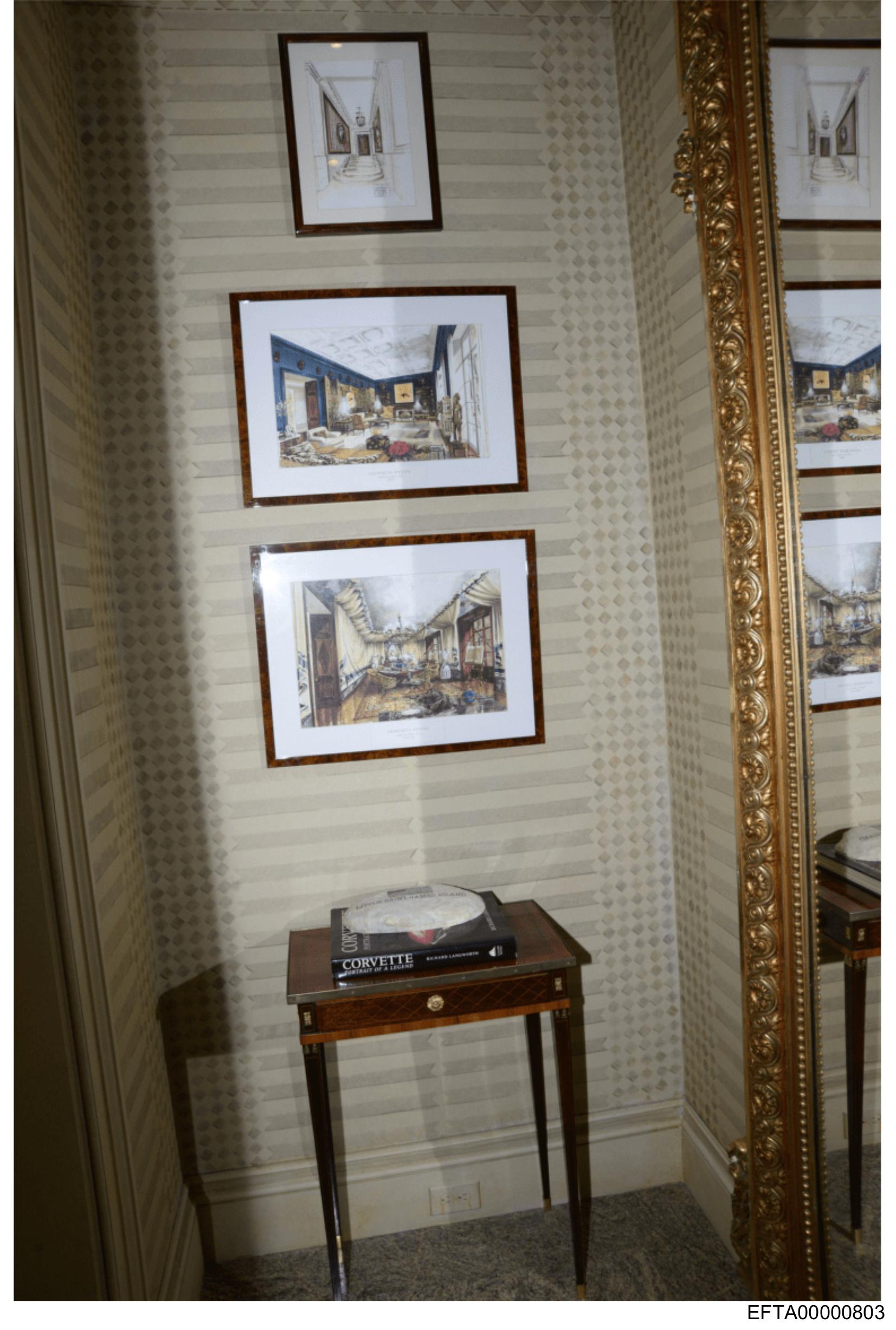 The image depicts an interior scene with a wall on the left side adorned with four framed artworks depicting various architectural interiors.